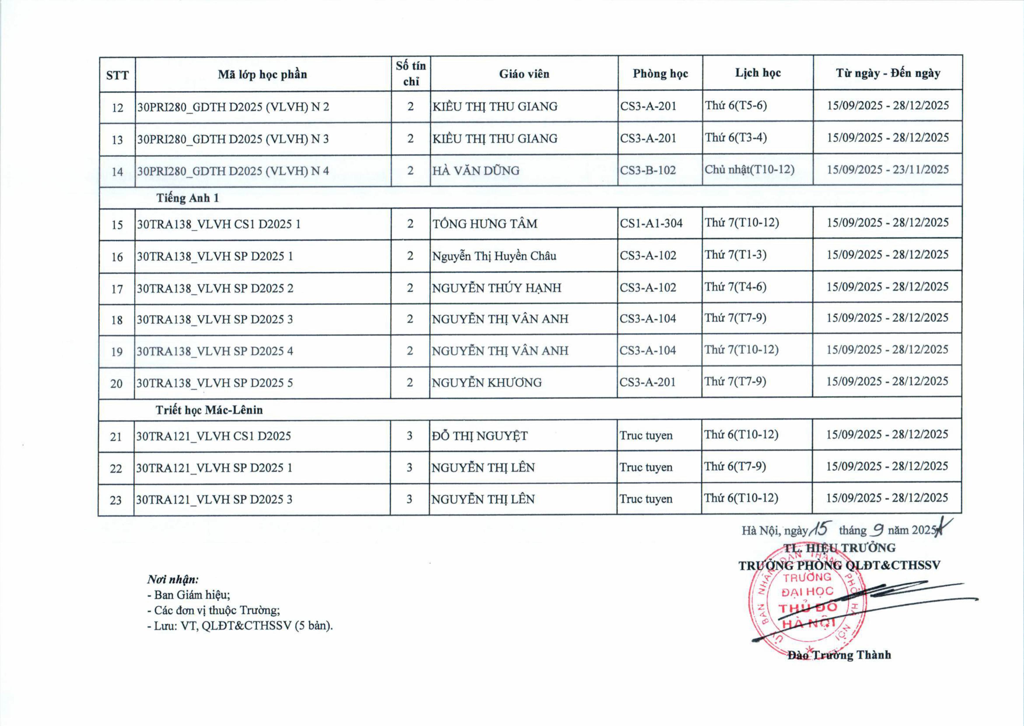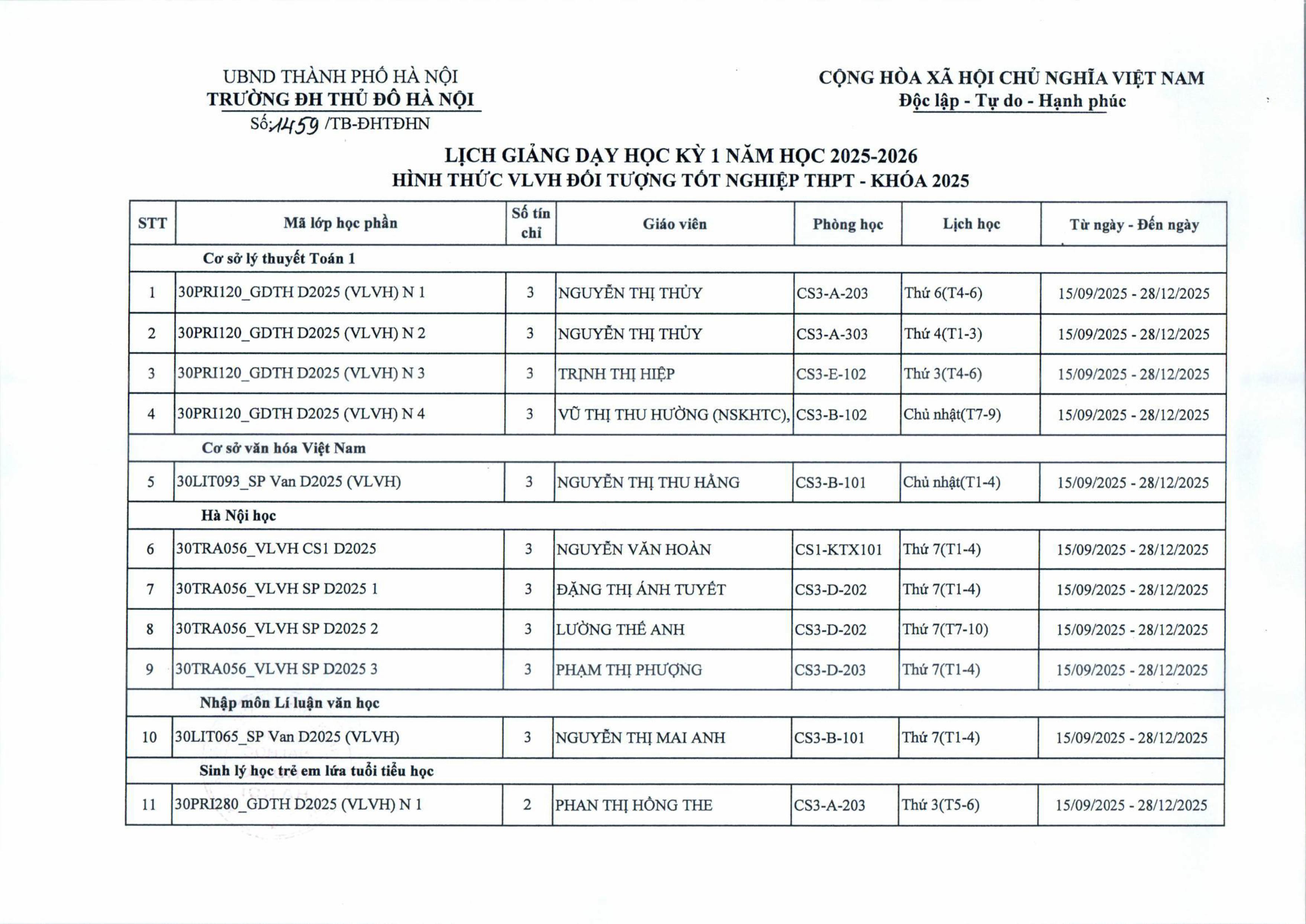THÔNG BÁO Lịch giảng dạy học kỳ 1 năm học 2025-2026 hình thức VLVH