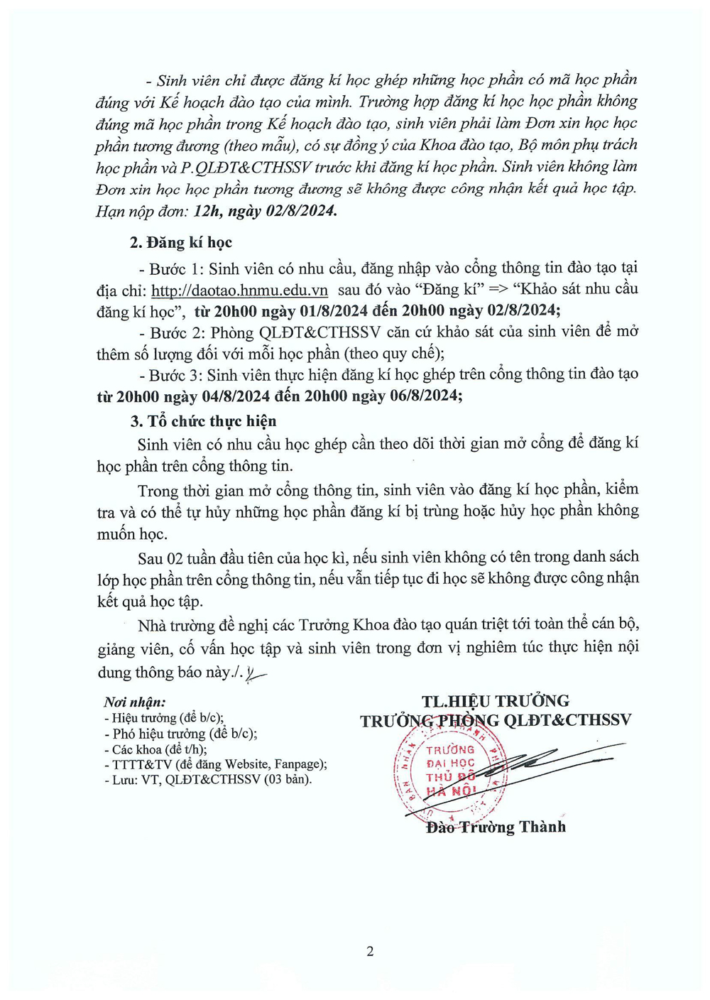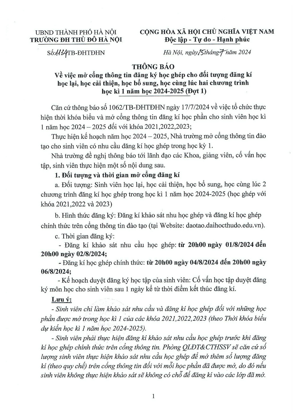 Thông báo mở cổng thông tin đăng kí học ghép cho đối tượng đăng kí học lại, học cải thiện, học bổ sung, học cùng lúc hai chương trình học kì 1 năm học 2024-2025 (Đợt 1)