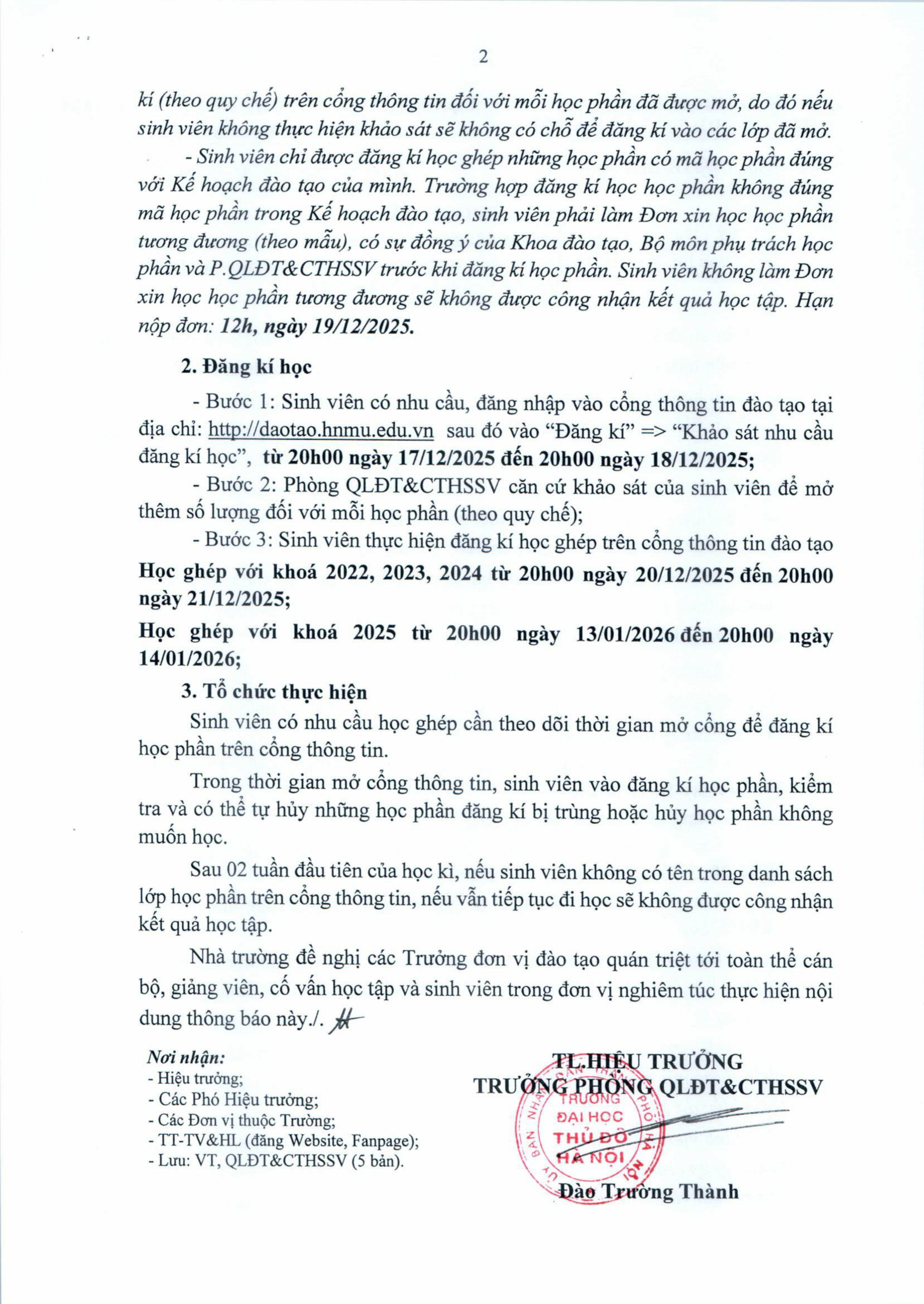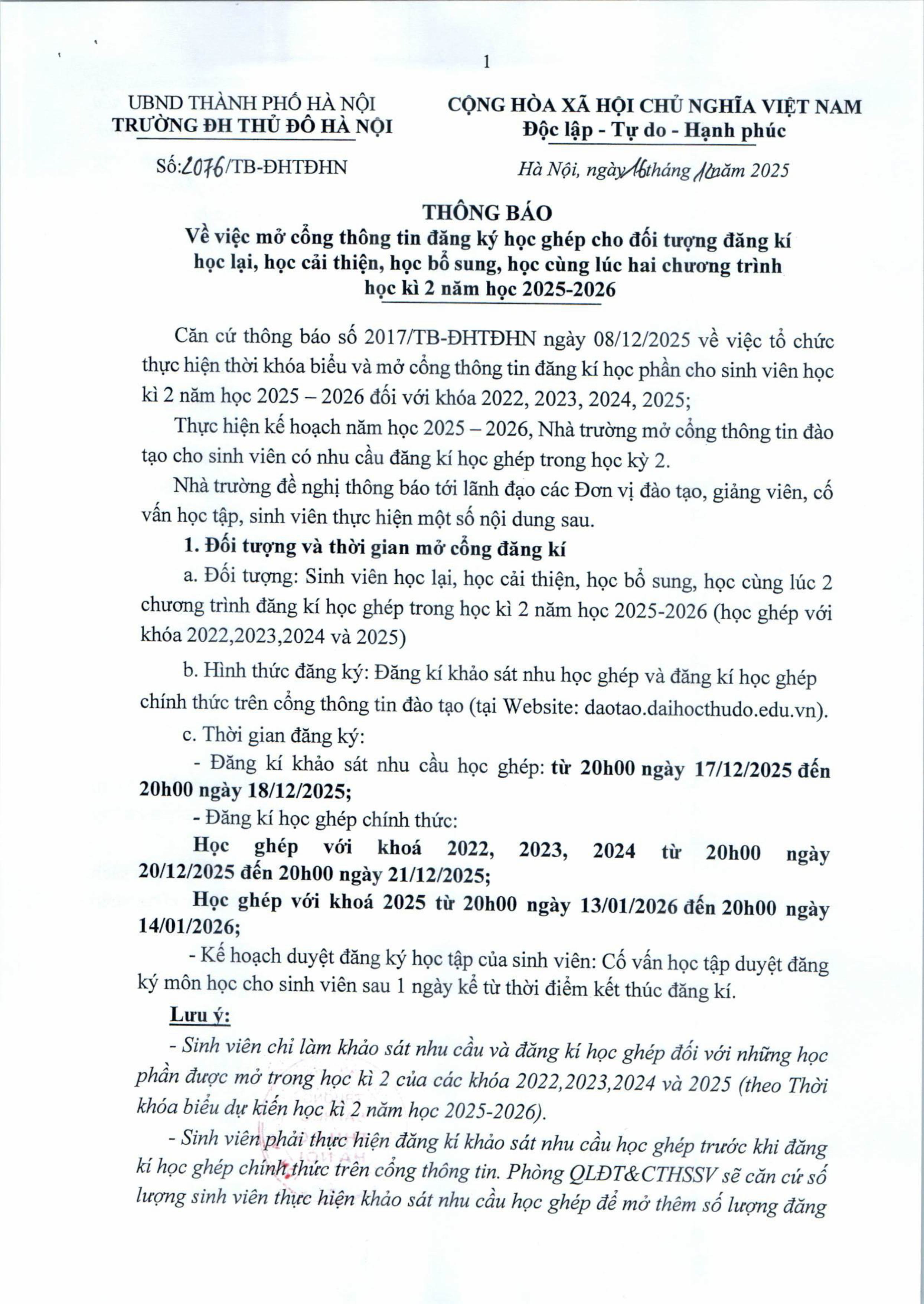 Thông báo mở cổng thông tin đăng ký học ghép cho đối tượng đăng kí học lại, học cải thiện, học bổ sung, học cùng lúc hai chương trình học kì 2 năm học 2025 - 2026