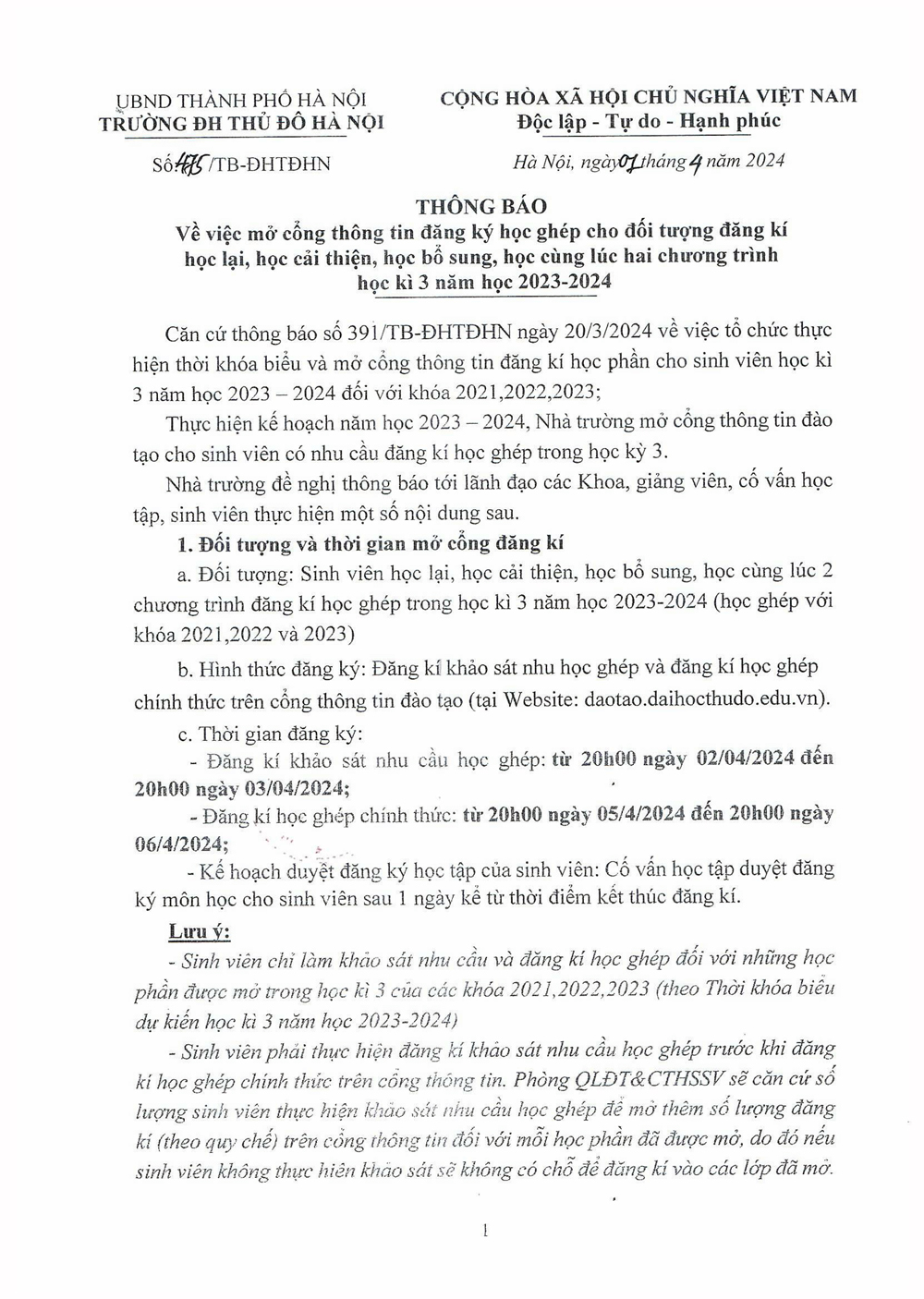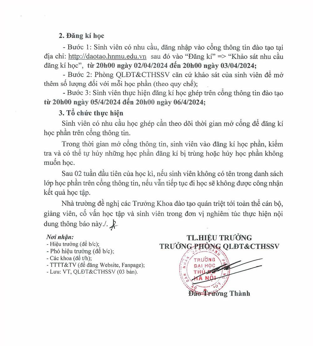Thông báo mở cổng thông tin đăng ký học ghép cho đối tượng đăng ký học lại, học cải thiện, học bổ sung, học cùng lúc 2 chương trình học kỳ 3 2024