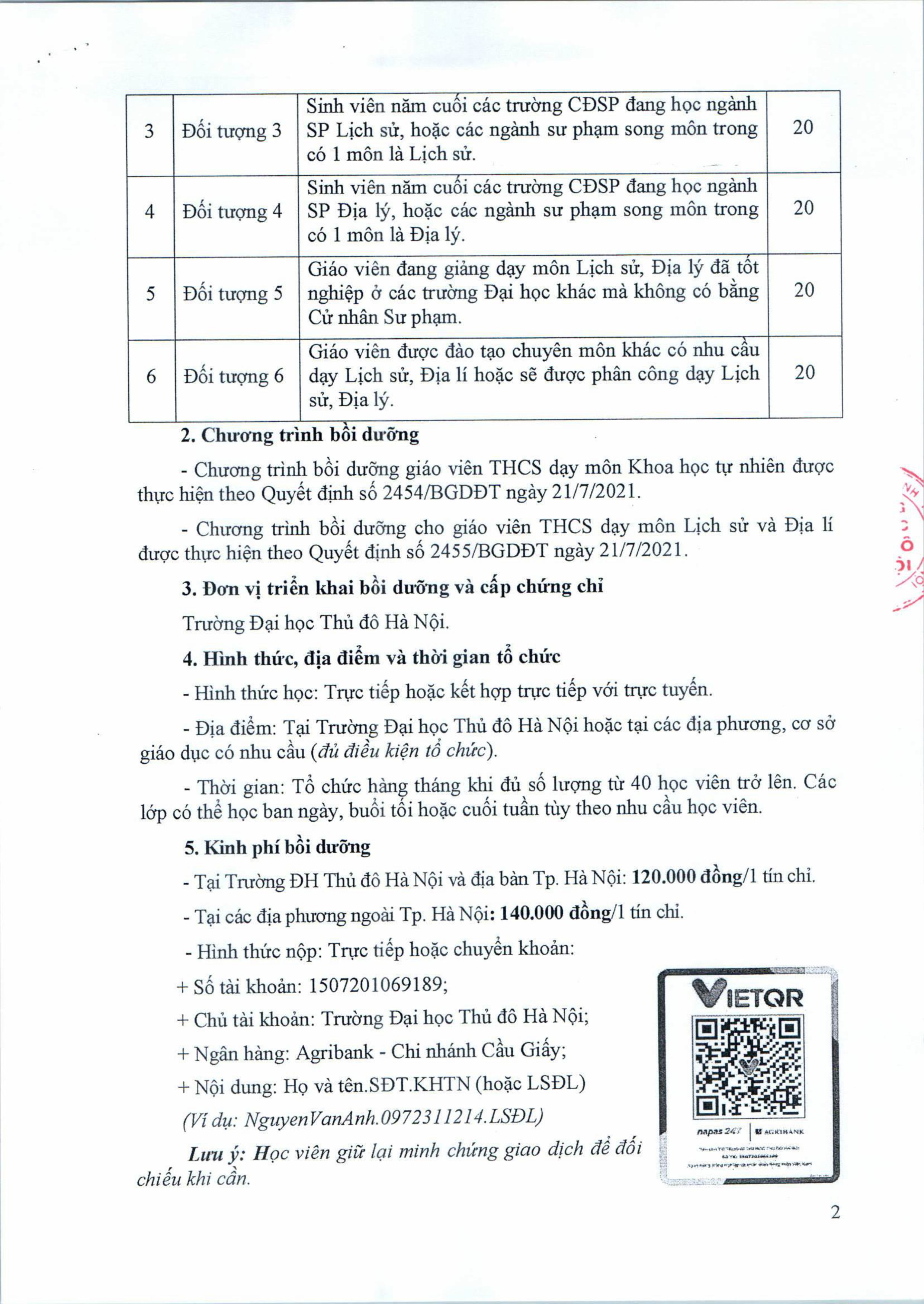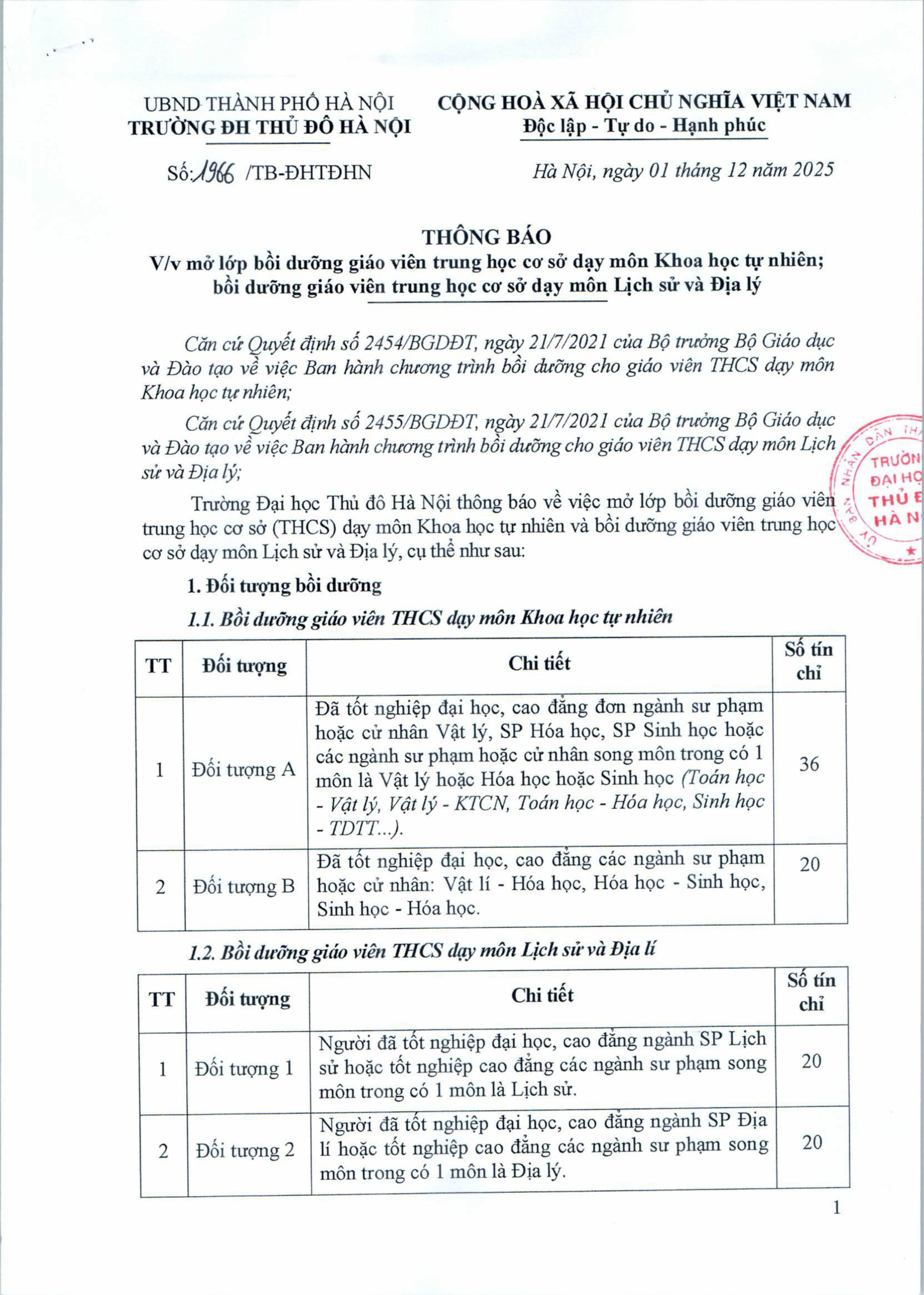 Thông báo mở lớp bồi dưỡng giáo viên trung học cơ sở dạy môn Khoa học tự nhiên; bồi dưỡng giáo viên trung học cơ sở dạy môn Lịch sử và Địa lý