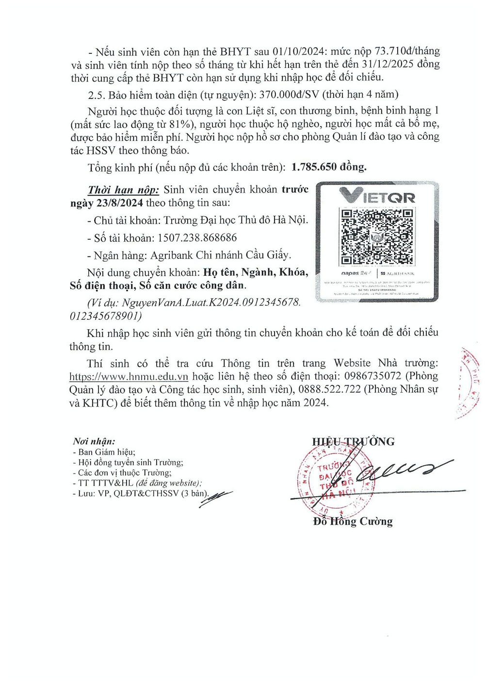 Thông báo nhập học đối với thí sinh trúng tuyển hệ đại học chính quy năm 2024 (Đợt 1)