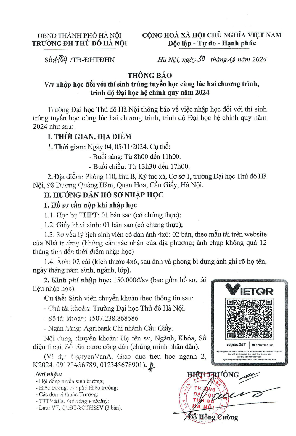 Thông báo nhập học đối với thí sinh trúng tuyển học cùng lúc hai chương trình, trình độ Đại học hệ chính quy 2024