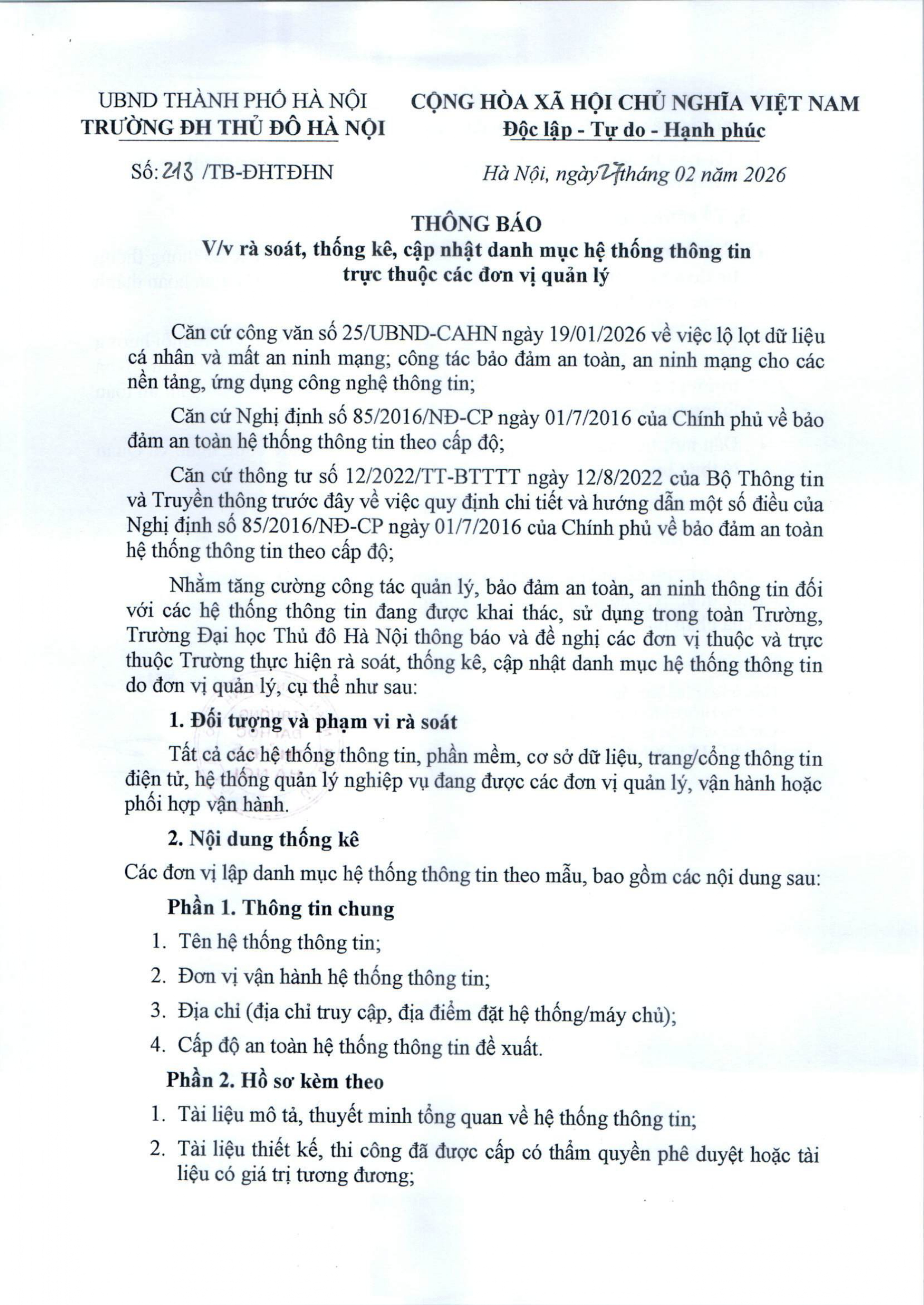 Thông báo rà soát, thống kê, cập nhật danh mục hệ thống thông tin trực thuộc các đơn vị quản lý