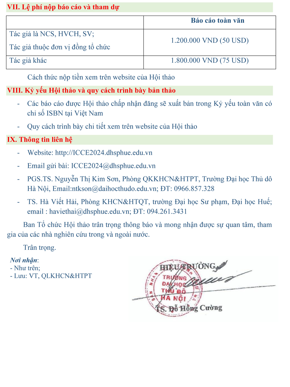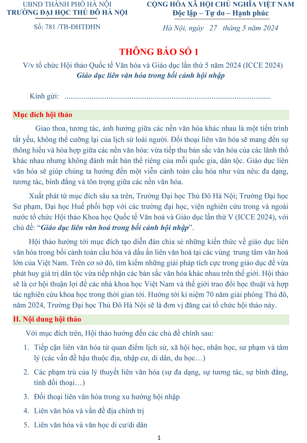 Thông báo số 1 tổ chức Hội thảo Quốc tế Văn hoá và Giáo dục lần thứ 5 năm 2024 (ICCE 2024)