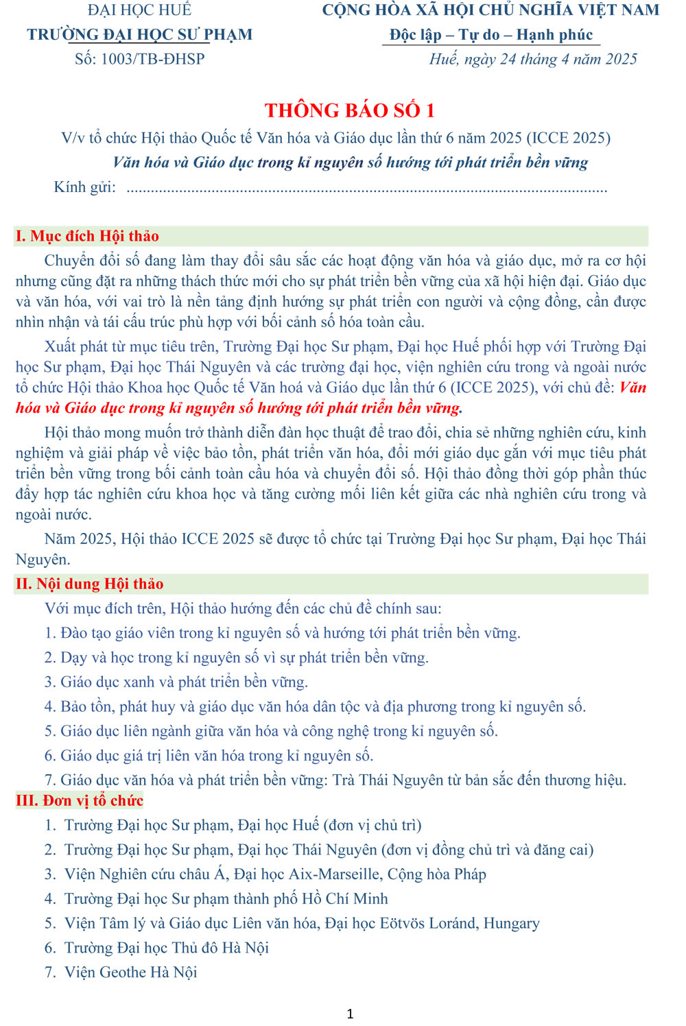 Thông báo số 1 về việc tổ chức Hội thảo Quốc tế Văn hoá và Giáo dục lần thứ 6 năm 2025 (ICCE 2025)