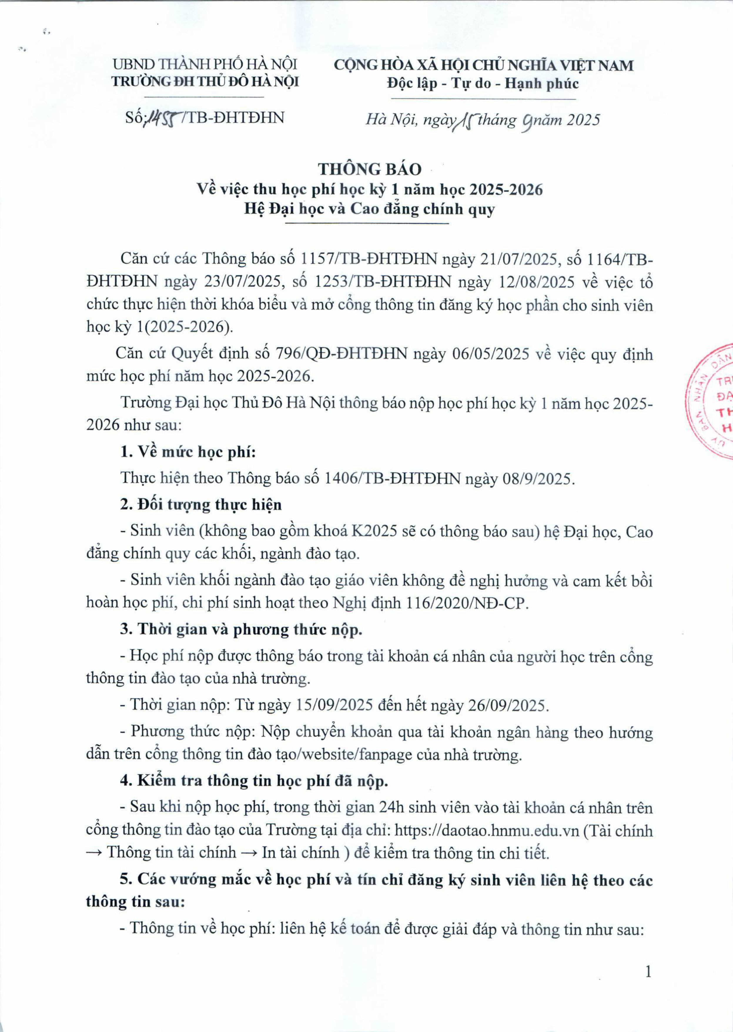 THÔNG BÁO Thu học phí học kỳ 1 năm học 2025-2026 Hệ Đại học và Cao đẳng chính quy
