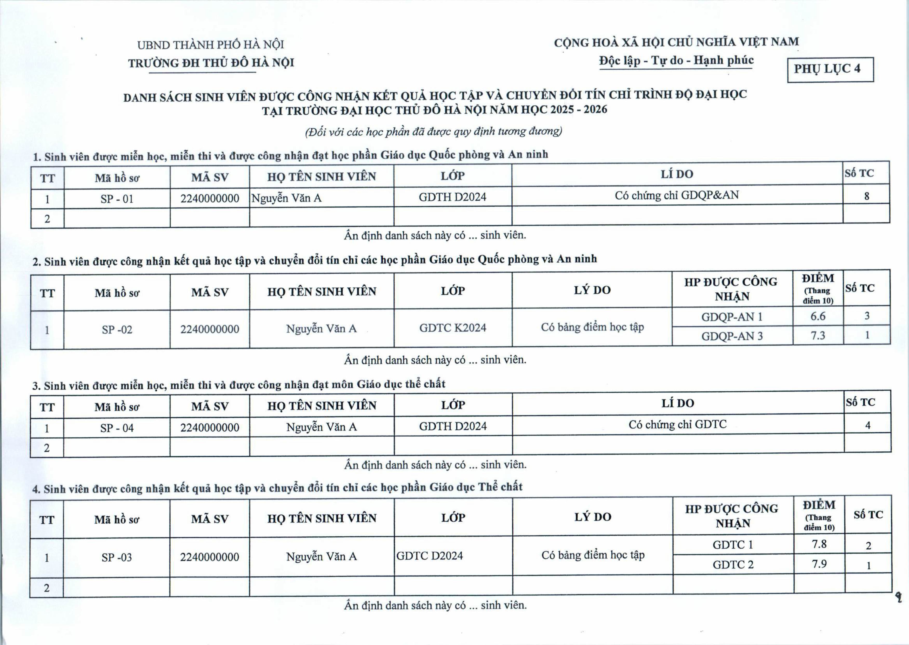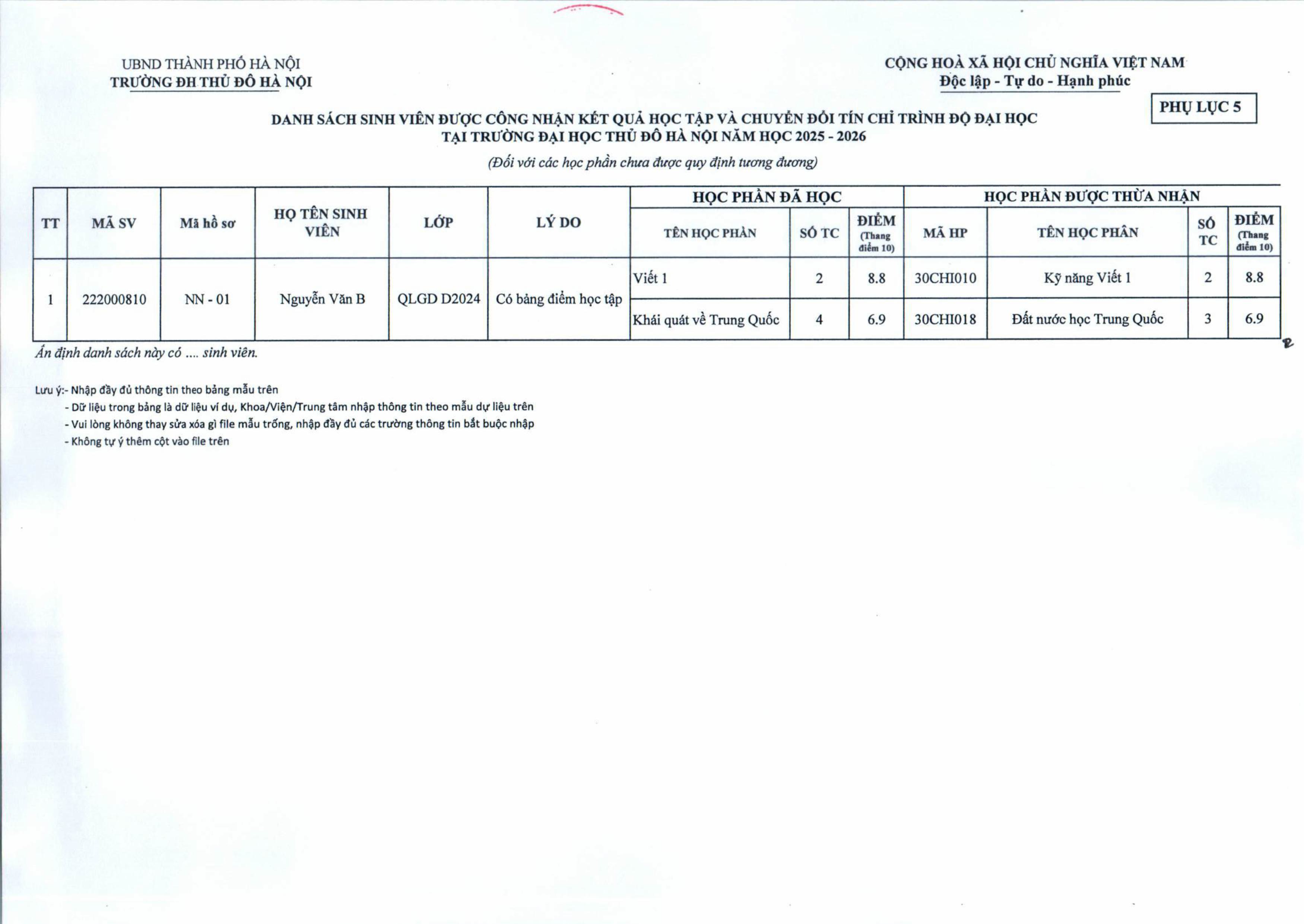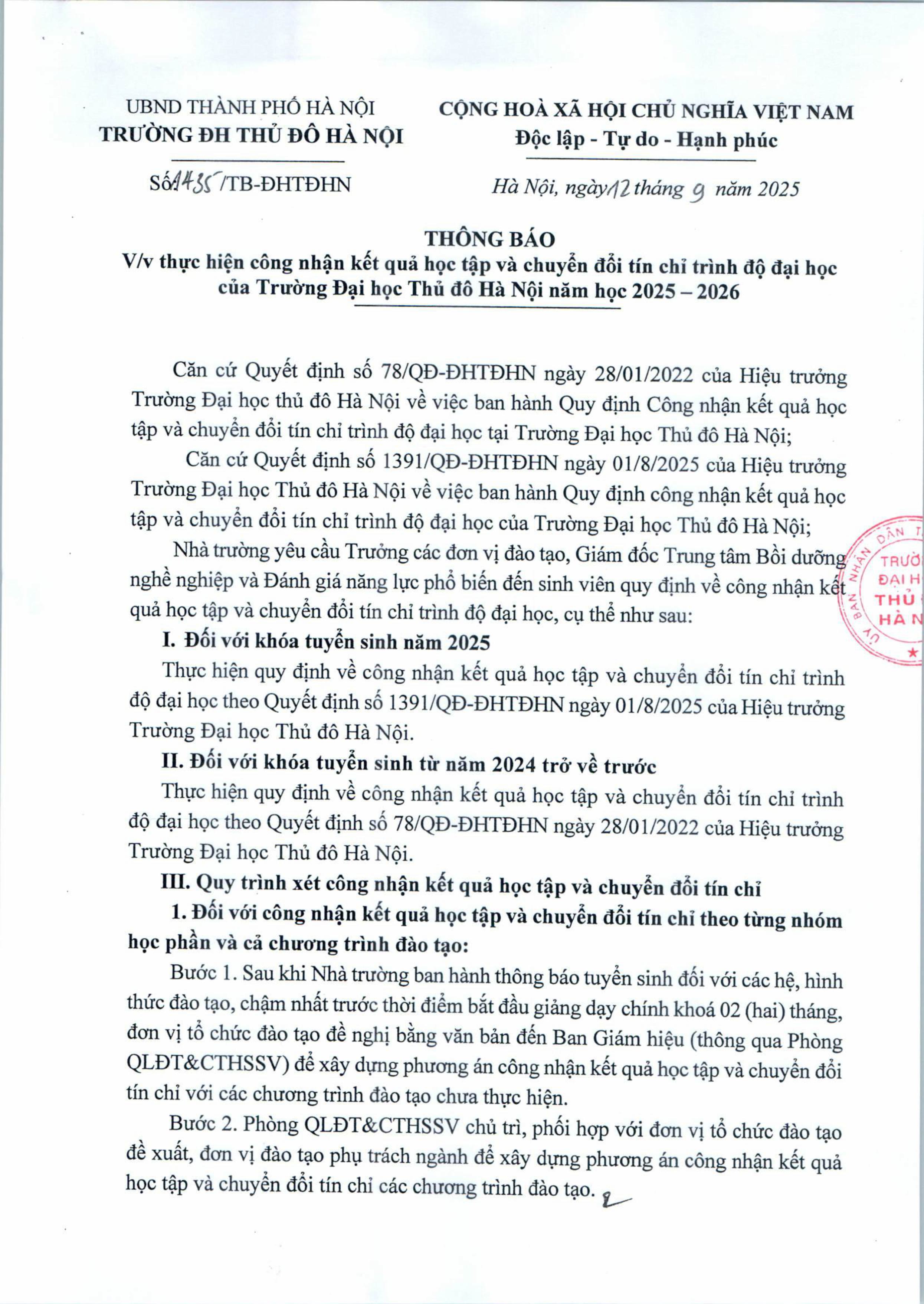 THÔNG BÁO Thực hiện công nhận kết quả học tập và chuyển đổi tín chỉ trình độ đại học của trường Đại học Thủ Đô Hà Nội năm học 2025-2026