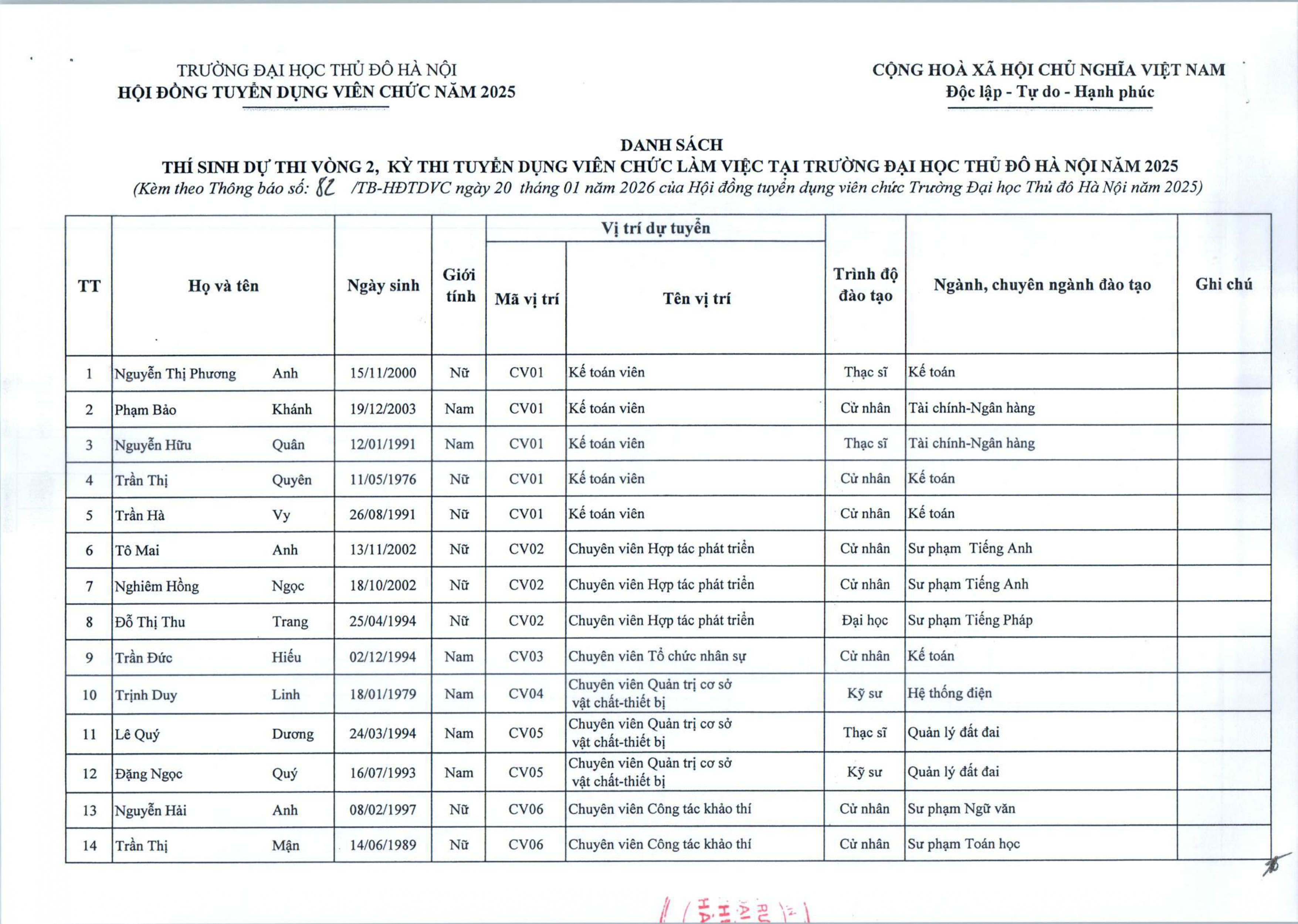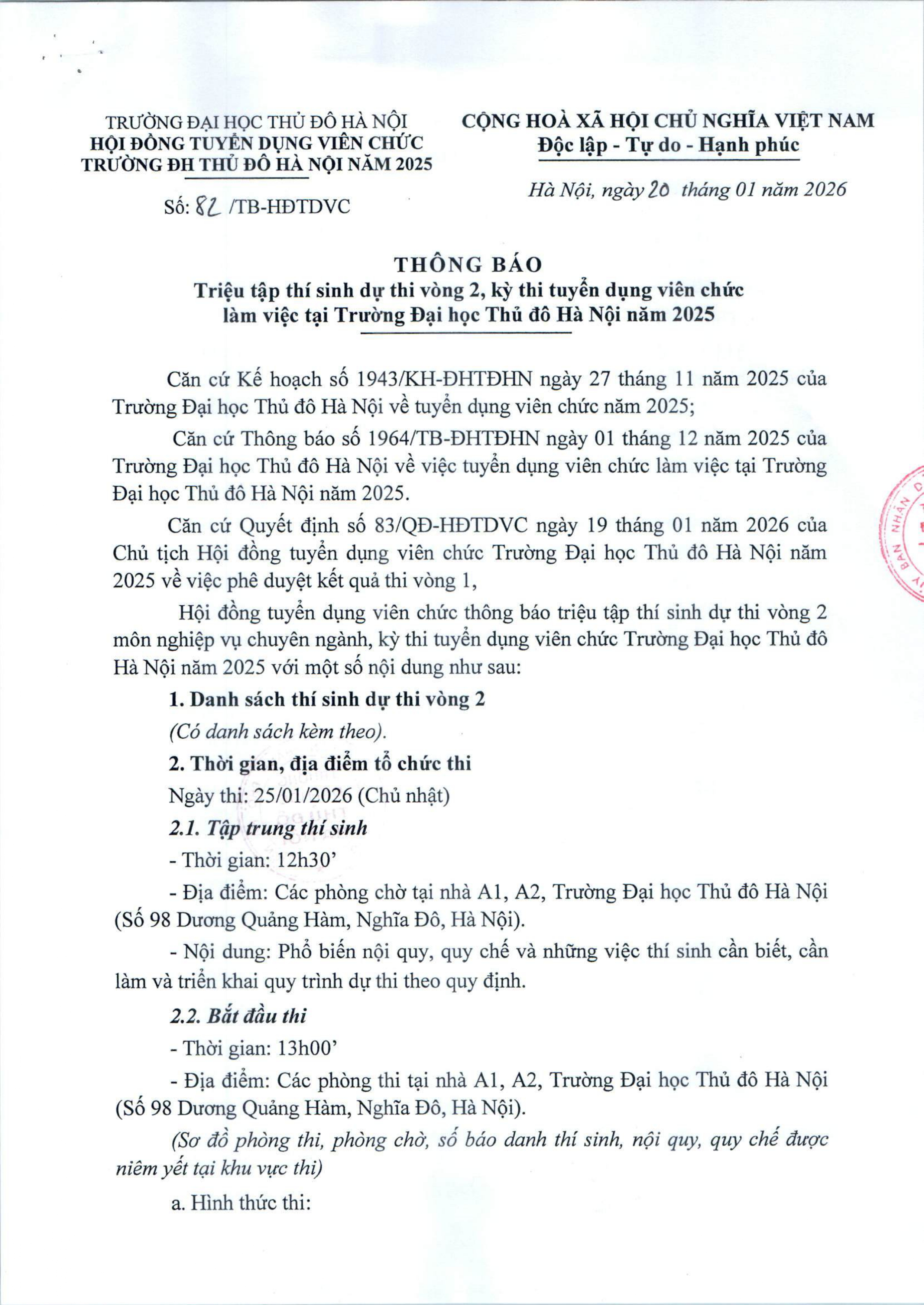 Thông báo triệu tập thí sinh dự thi vòng 2, kỳ thi tuyển dụng viên chức làm việc tại Trường Đại học Thủ đô Hà Nội năm 2025