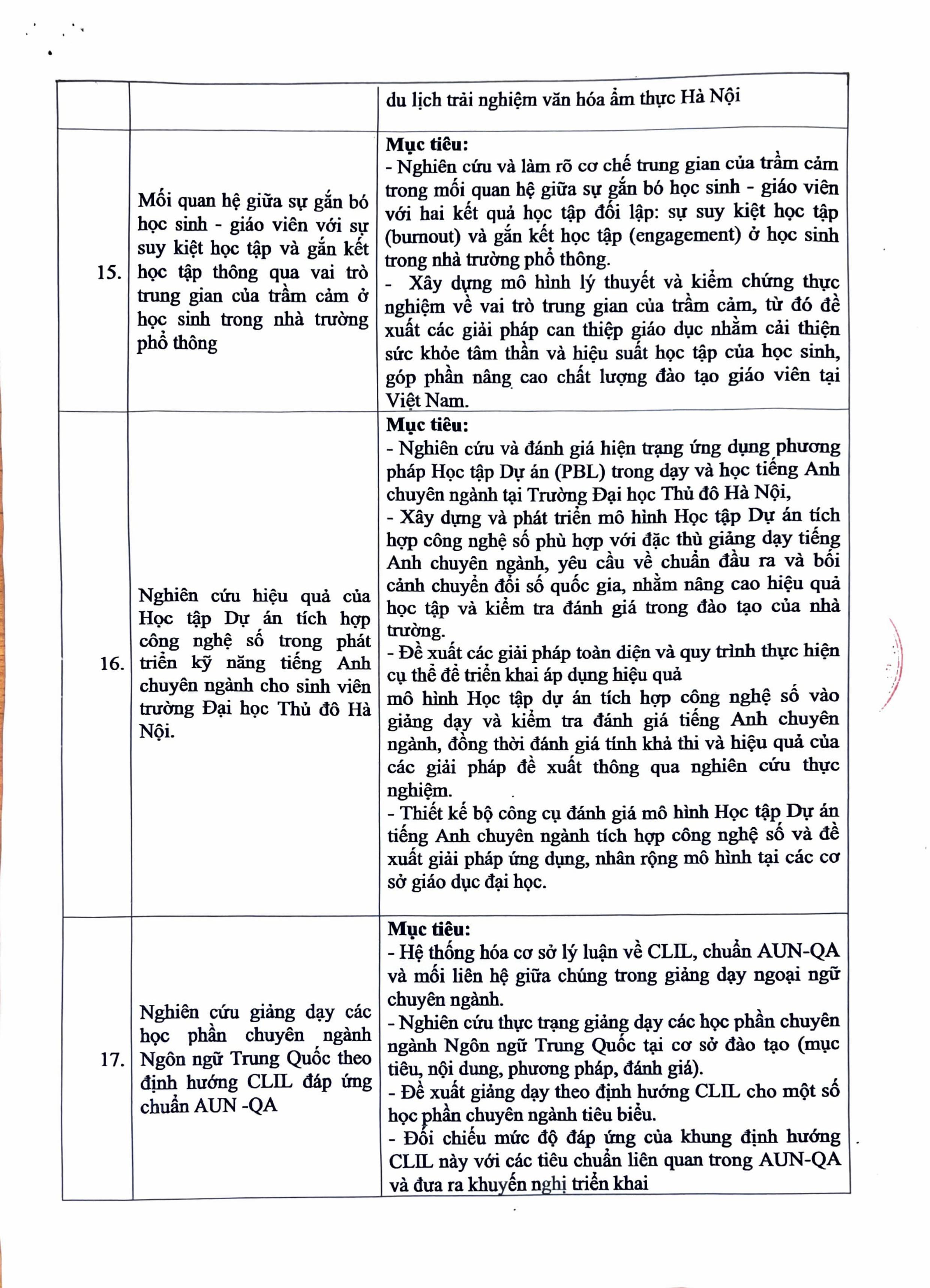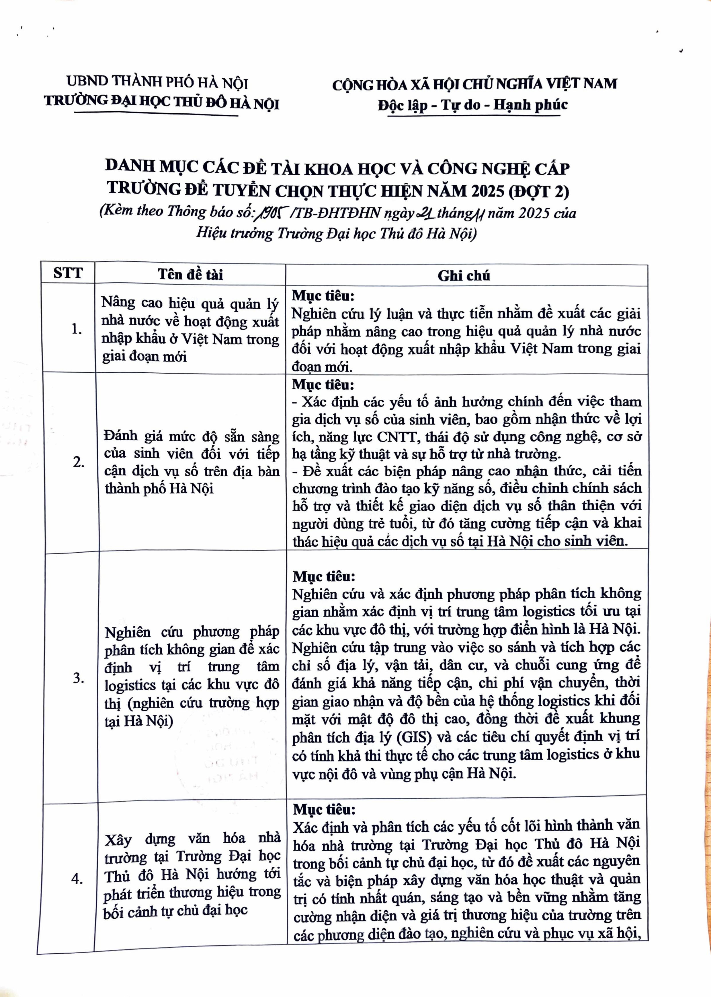 Căn cứ Quyết định số 2077/QĐ-ĐHTĐHN ngày 21/11/2025 của Hiệu trưởng trường Đại học Thủ đô Hà Nội về việc phê duyệt danh mục đề tài khoa học và công nghệ cấp trường để tuyển chọn thực hiện năm 2025 (Đợt 2).