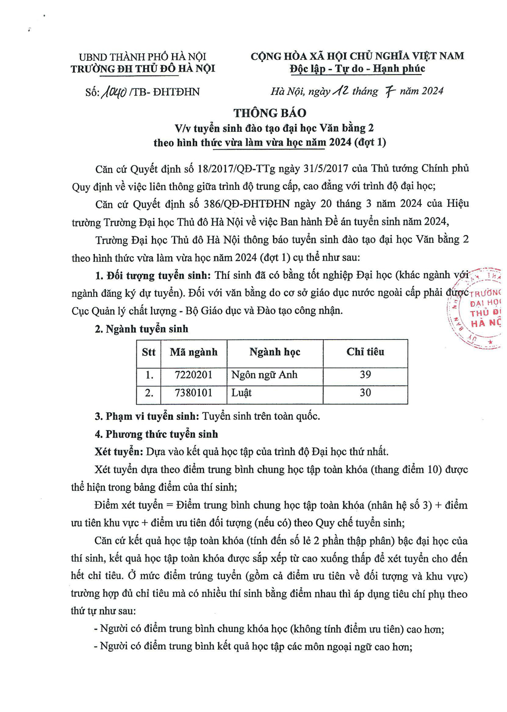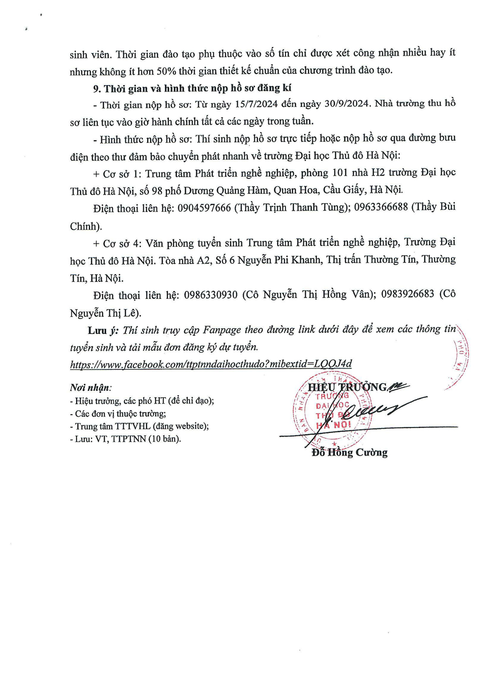 Đề án tuyển sinh trường Đại học Thủ đô Hà Nội 2024