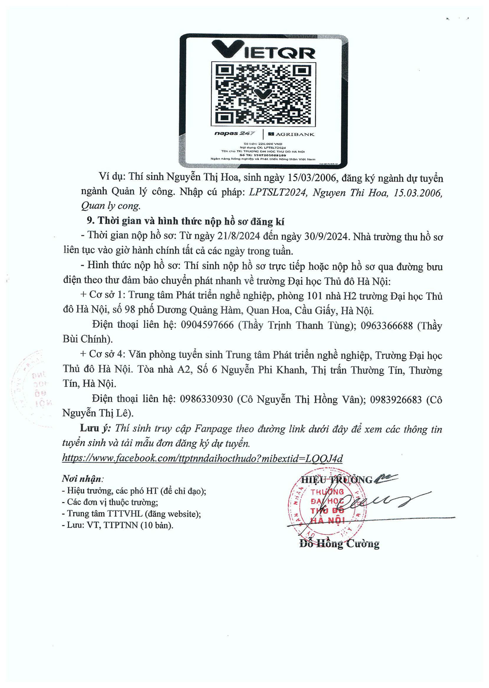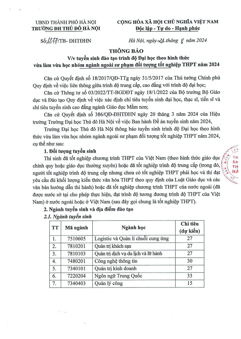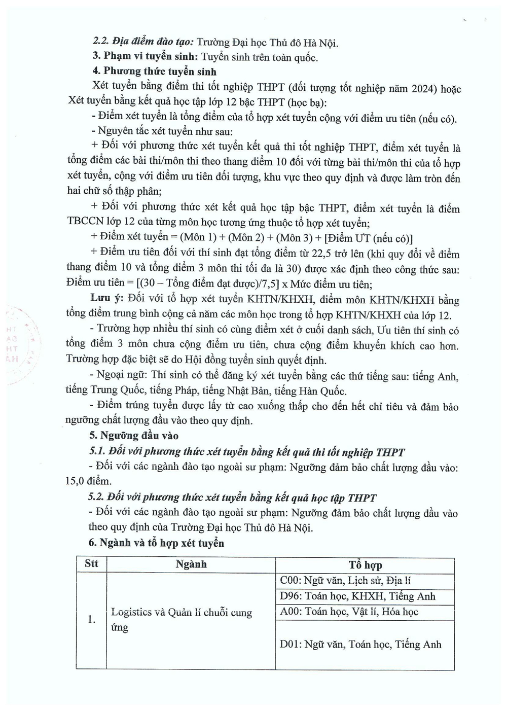 Đề án tuyển sinh trường Đại học Thủ đô Hà Nội 2024