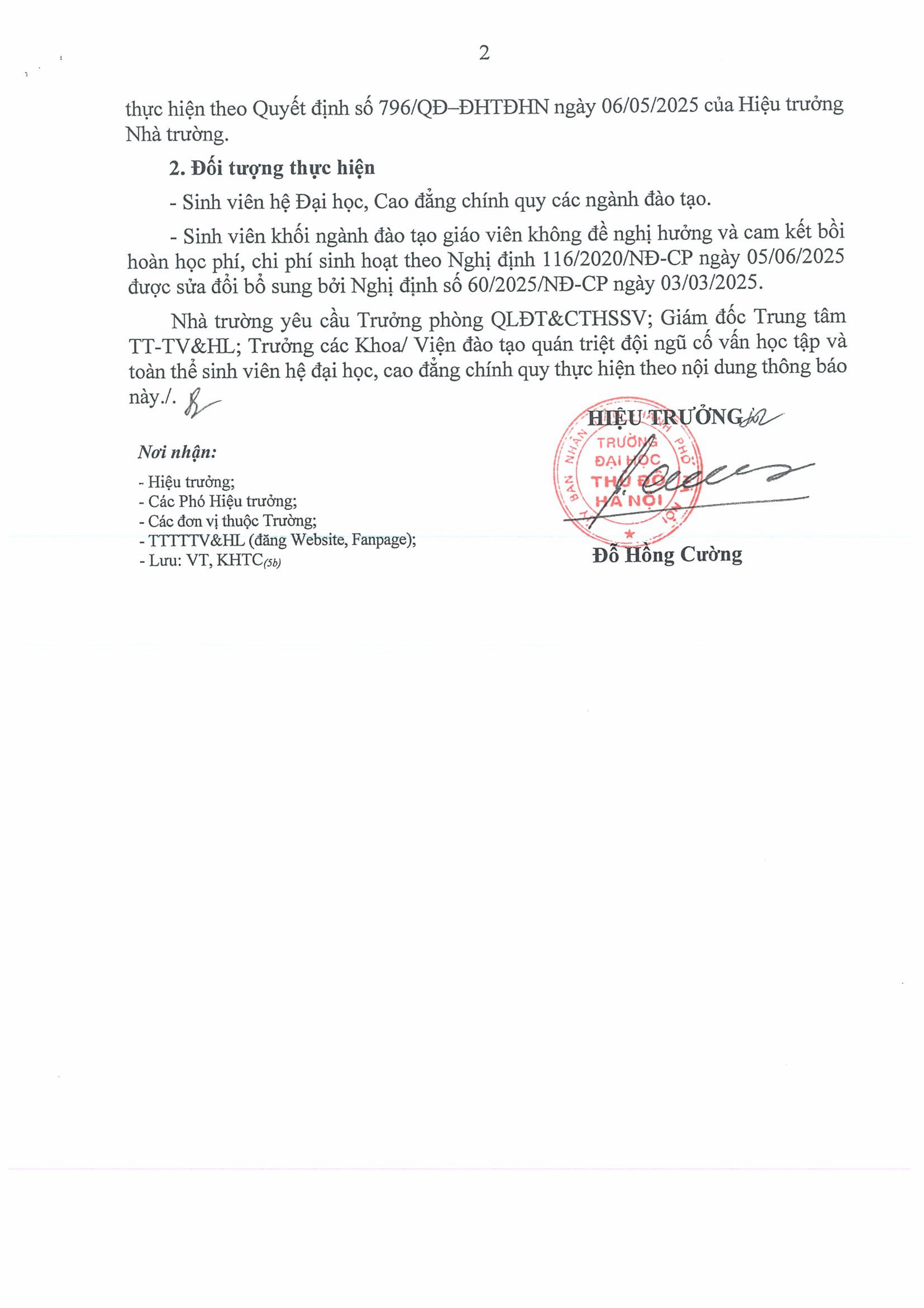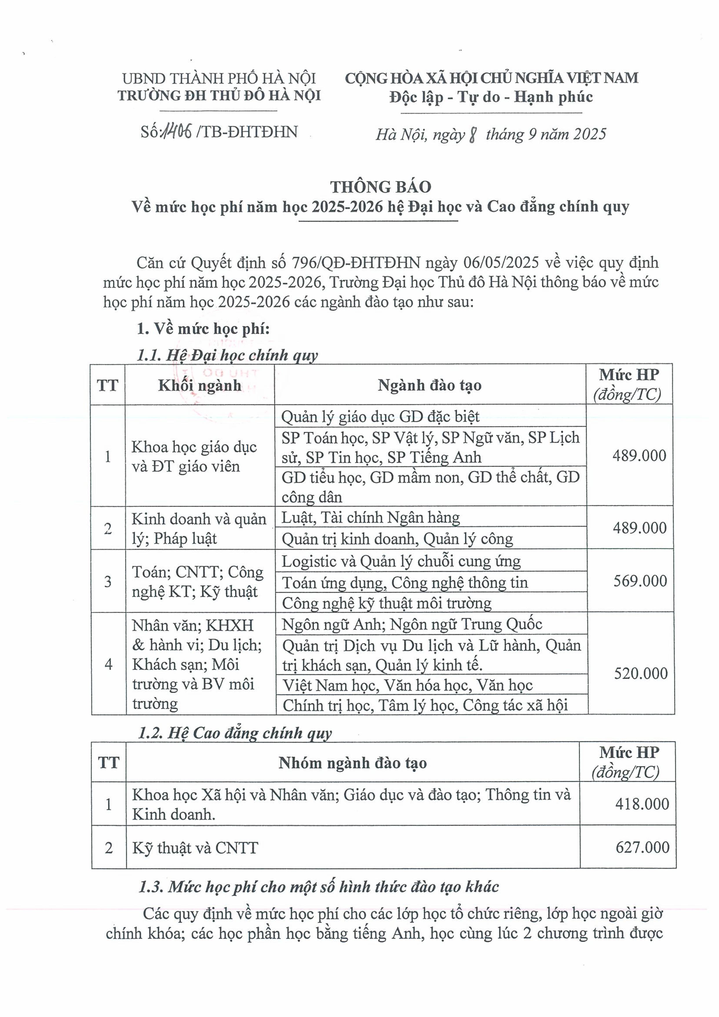 THÔNG BÁO về mức học phí năm học 2025-2026 hệ Đại học và Cao đằng chính quy