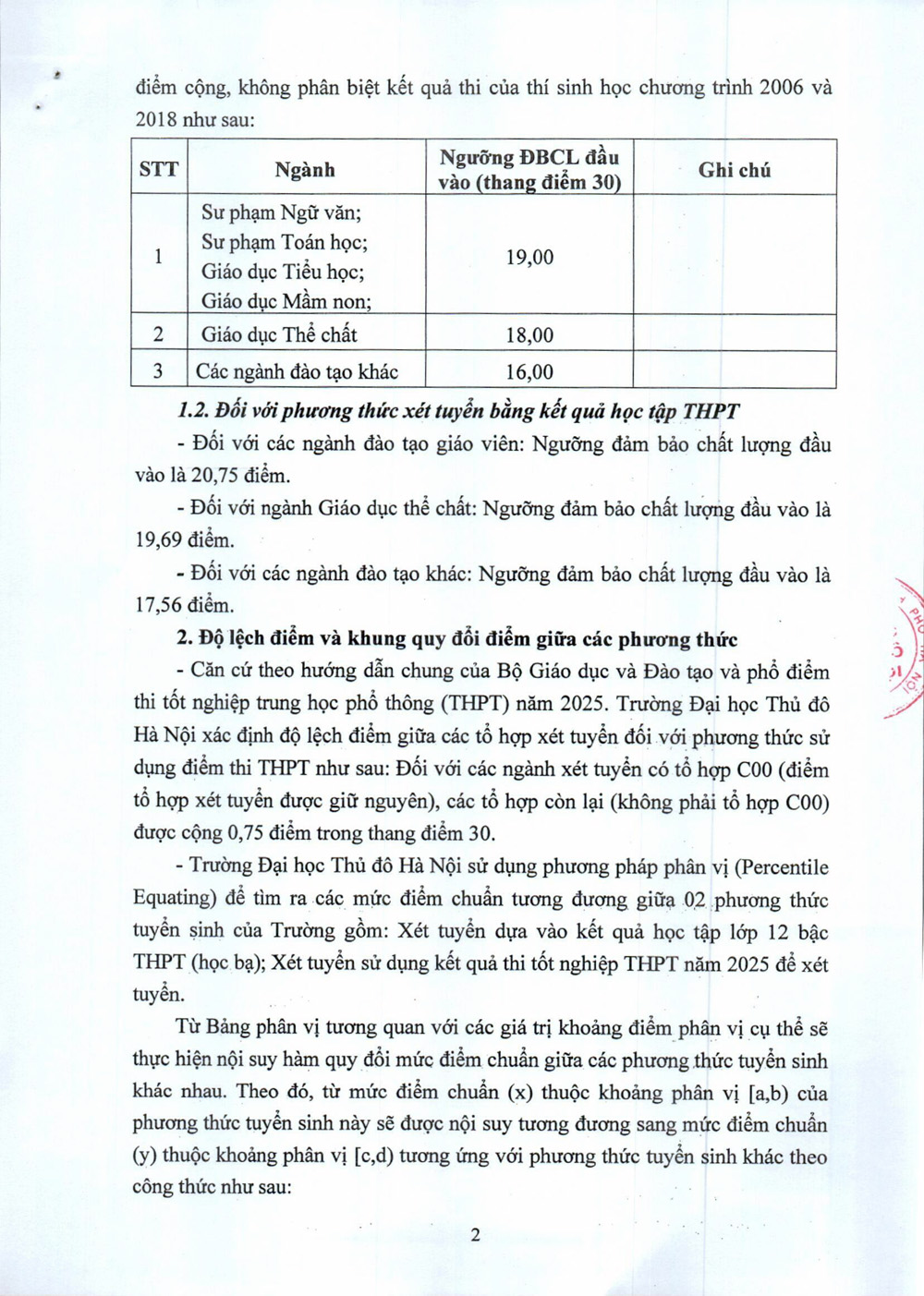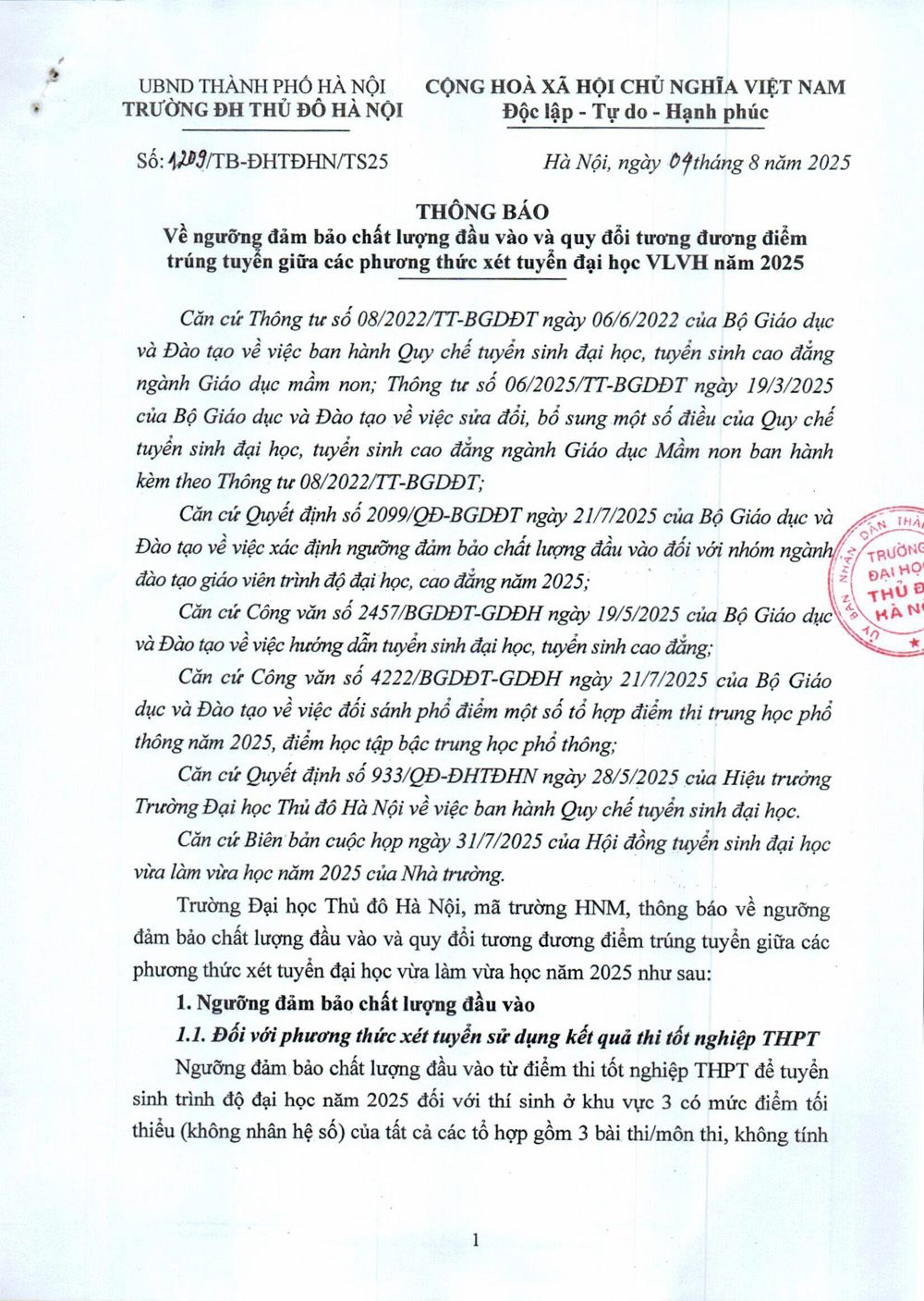 Thông báo về ngưỡng đảm bảo chất lượng đầu vào (điểm sàn) và quy đổi tương đương điểm trúng tuyển giữa các phương thức xét tuyển đại học VLVH năm 2025