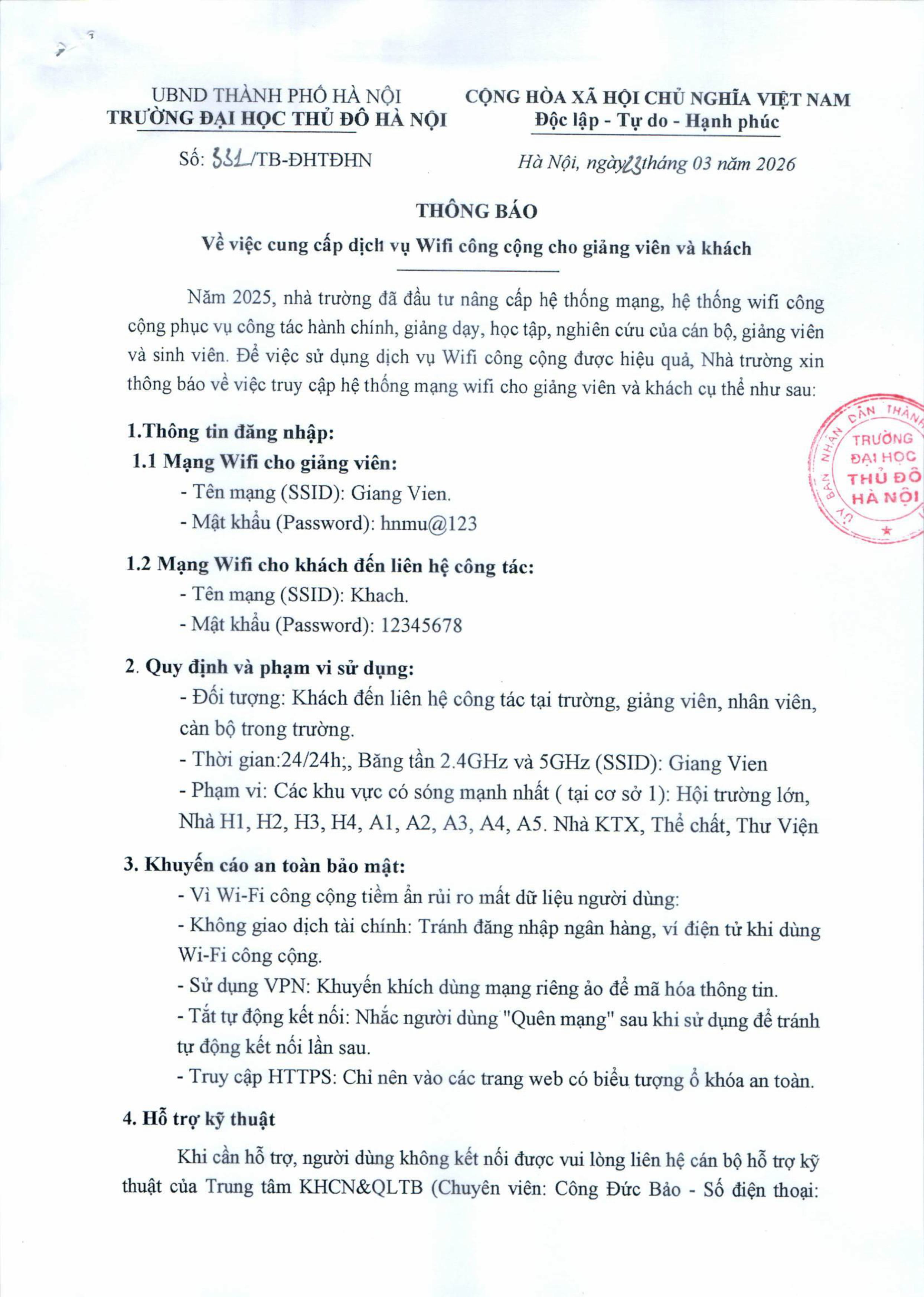 Thông báo về việc cung cấp dịch vụ Wifi công cộng cho giảng viên và khách
