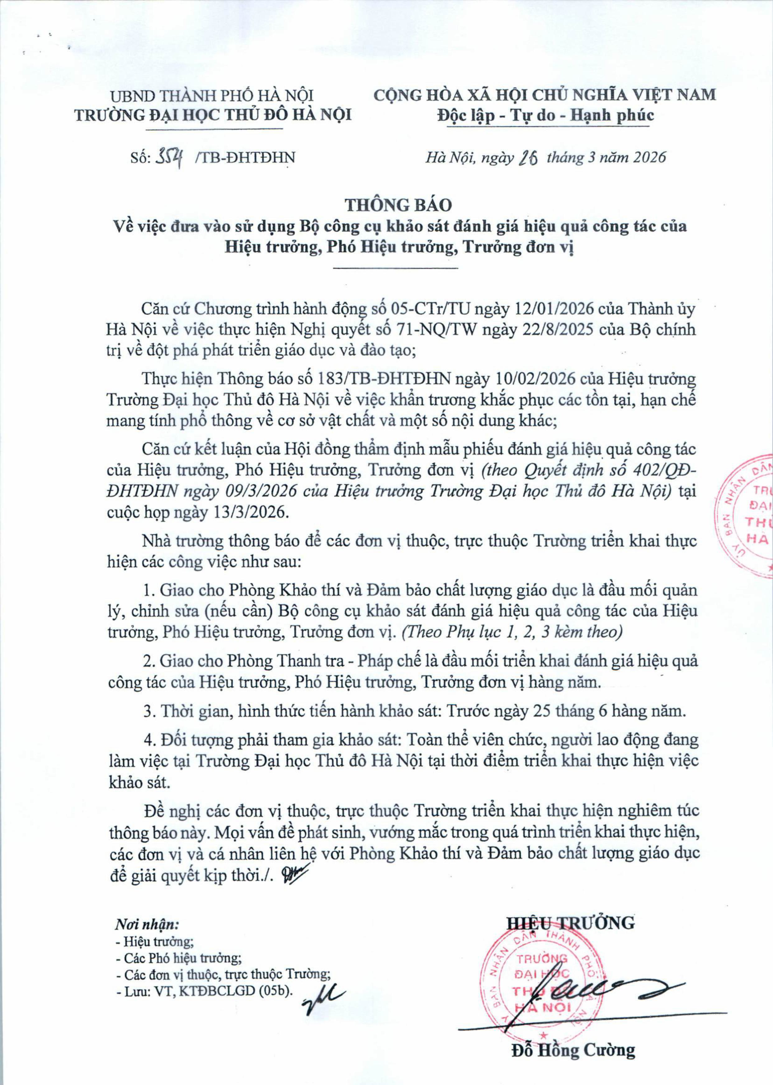 Thông báo về việc đưa vào sử dụng Bộ công cụ khảo sát đánh giá hiệu quả công tác của Hiệu trưởng, Phó Hiệu trưởng, Trưởng đơn vị