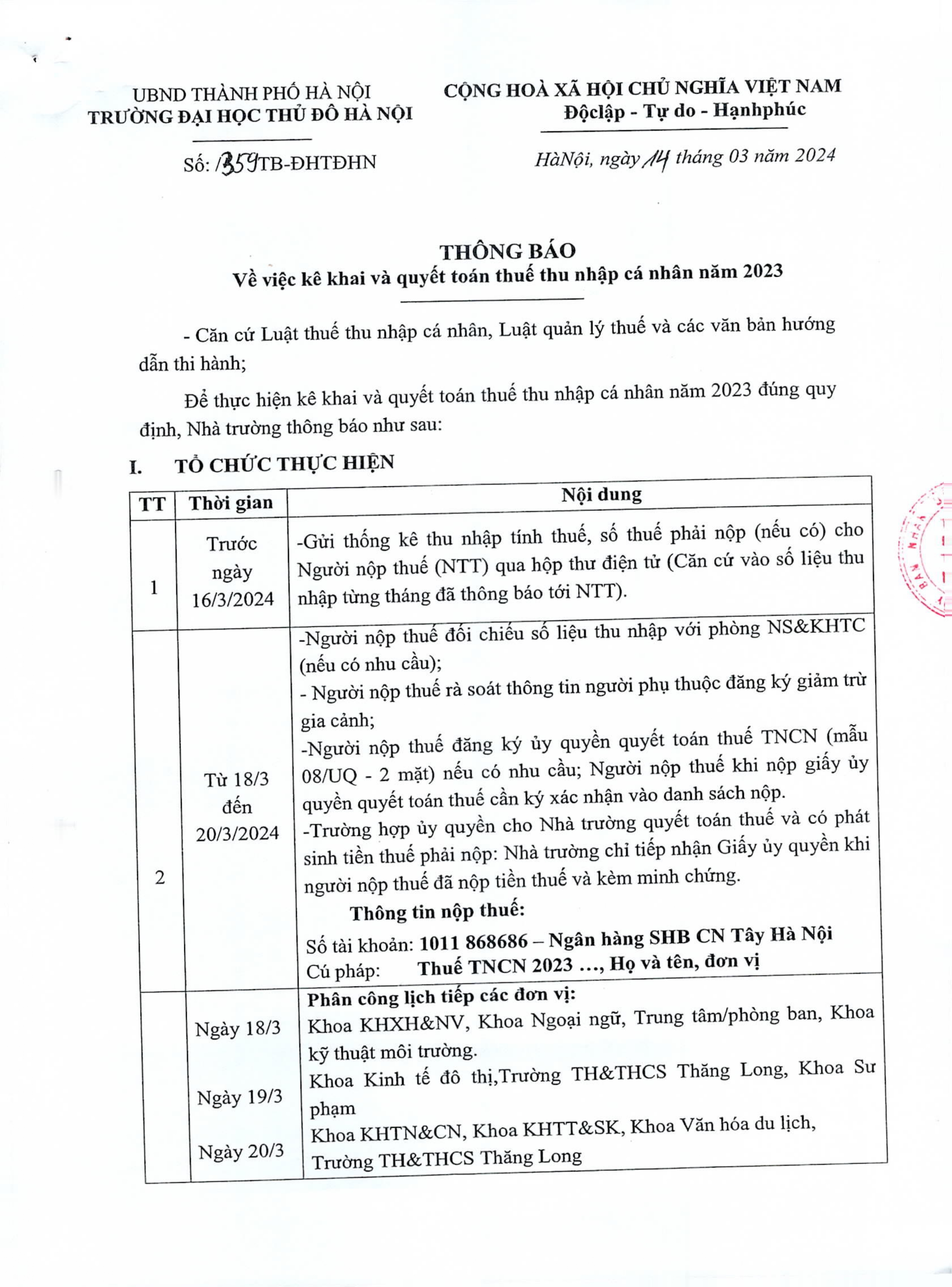 Thông báo về việc kê khai và quyết toán thuế thu nhập cá nhân năm 2023