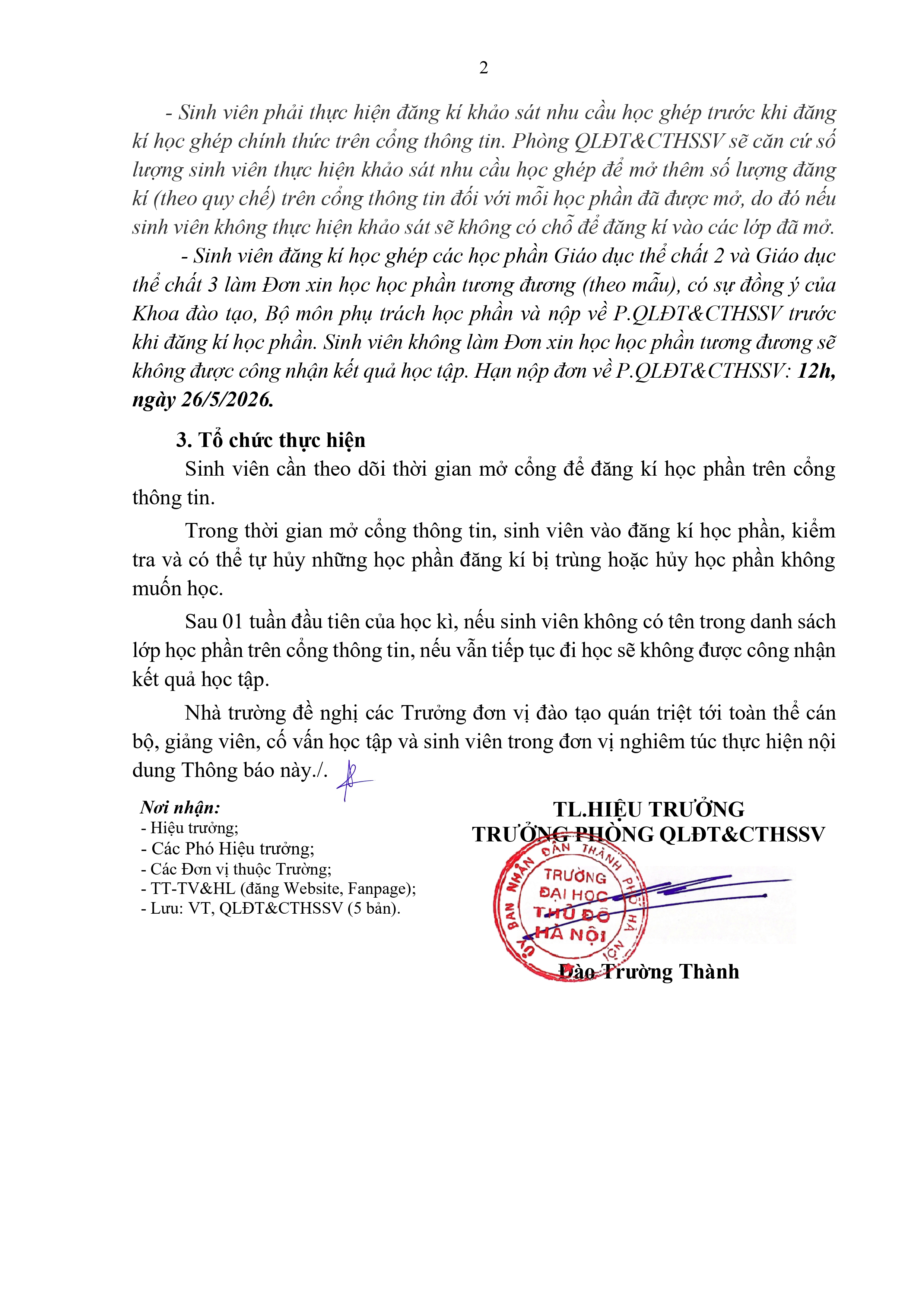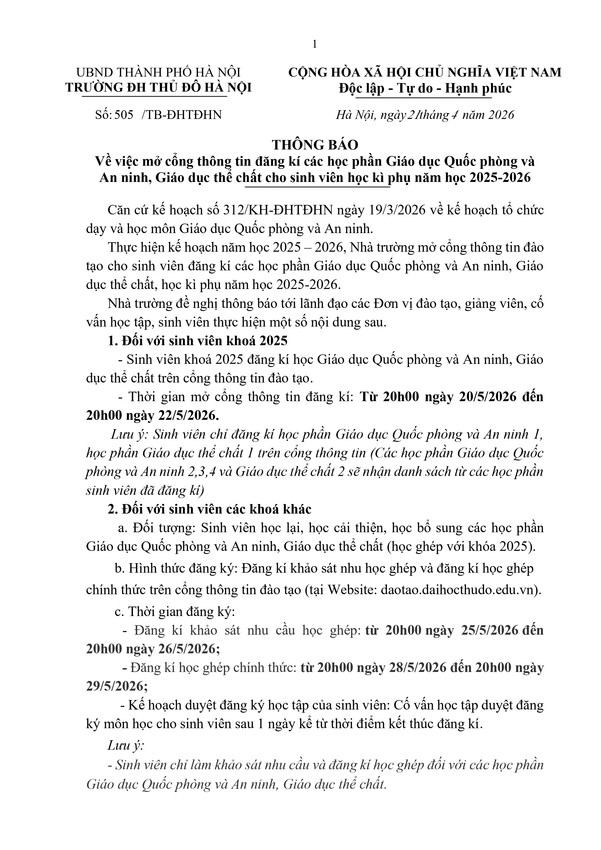 Thông báo về việc mở cổng thông tin đăng kí các học phần Giáo dục Quốc phòng và An ninh, Giáo dục thể chất cho sinh viên học kì phụ năm học 2025-2026