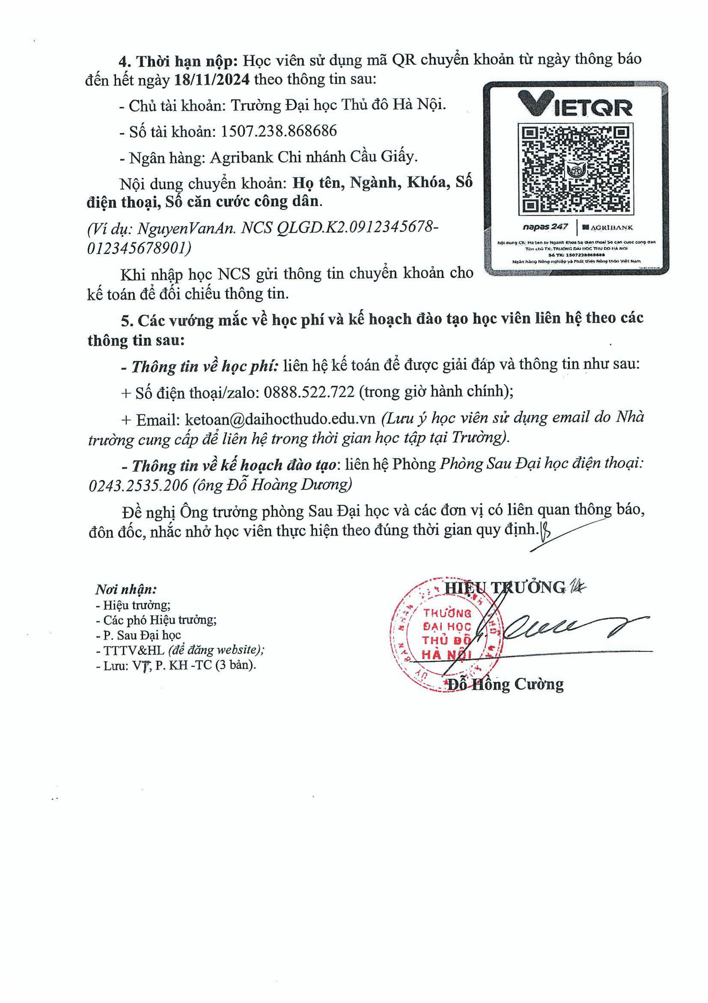 Thông báo về việc nộp học phí đợt 1 Nghiên cứu sinh khóa 2 Hệ đào tạo chính quy Sau đại học 08/11/2024 15:25:35 | Số lần xem: 66 1 phút