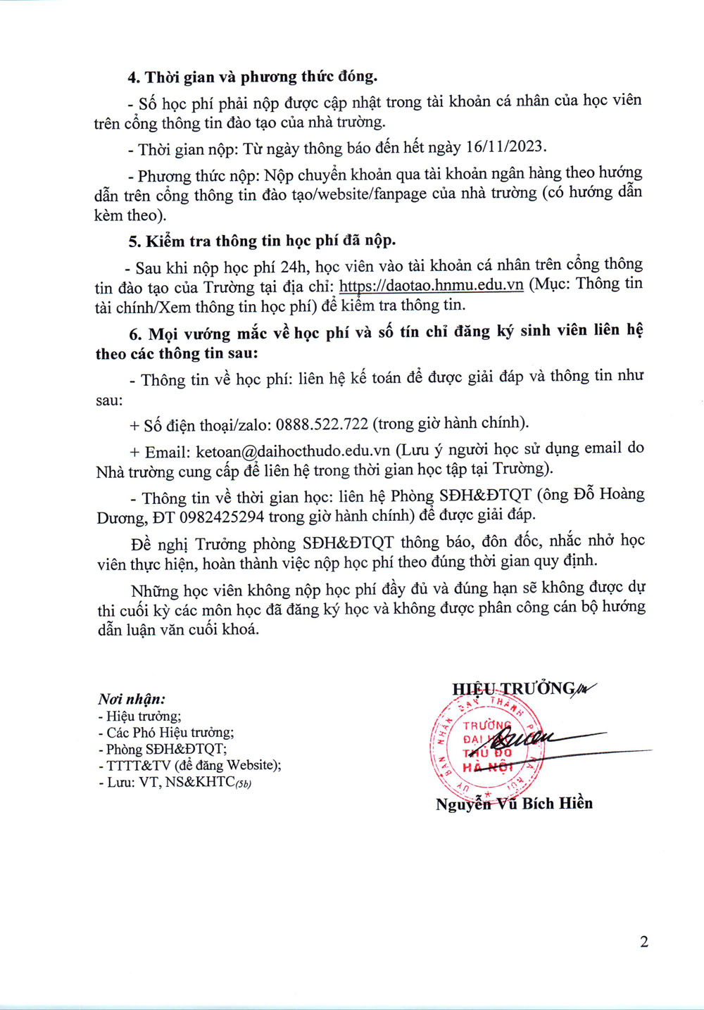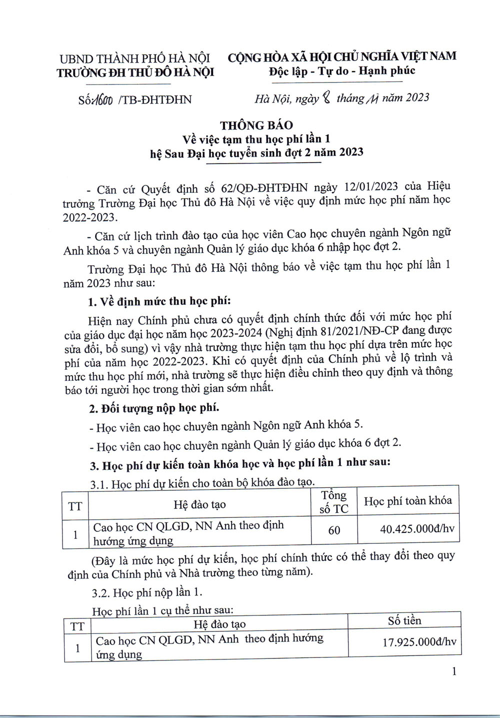 Thông báo về việc tạm thu học phí lần 1 hệ Sau Đại học tuyển sinh đợt 2 năm 2023