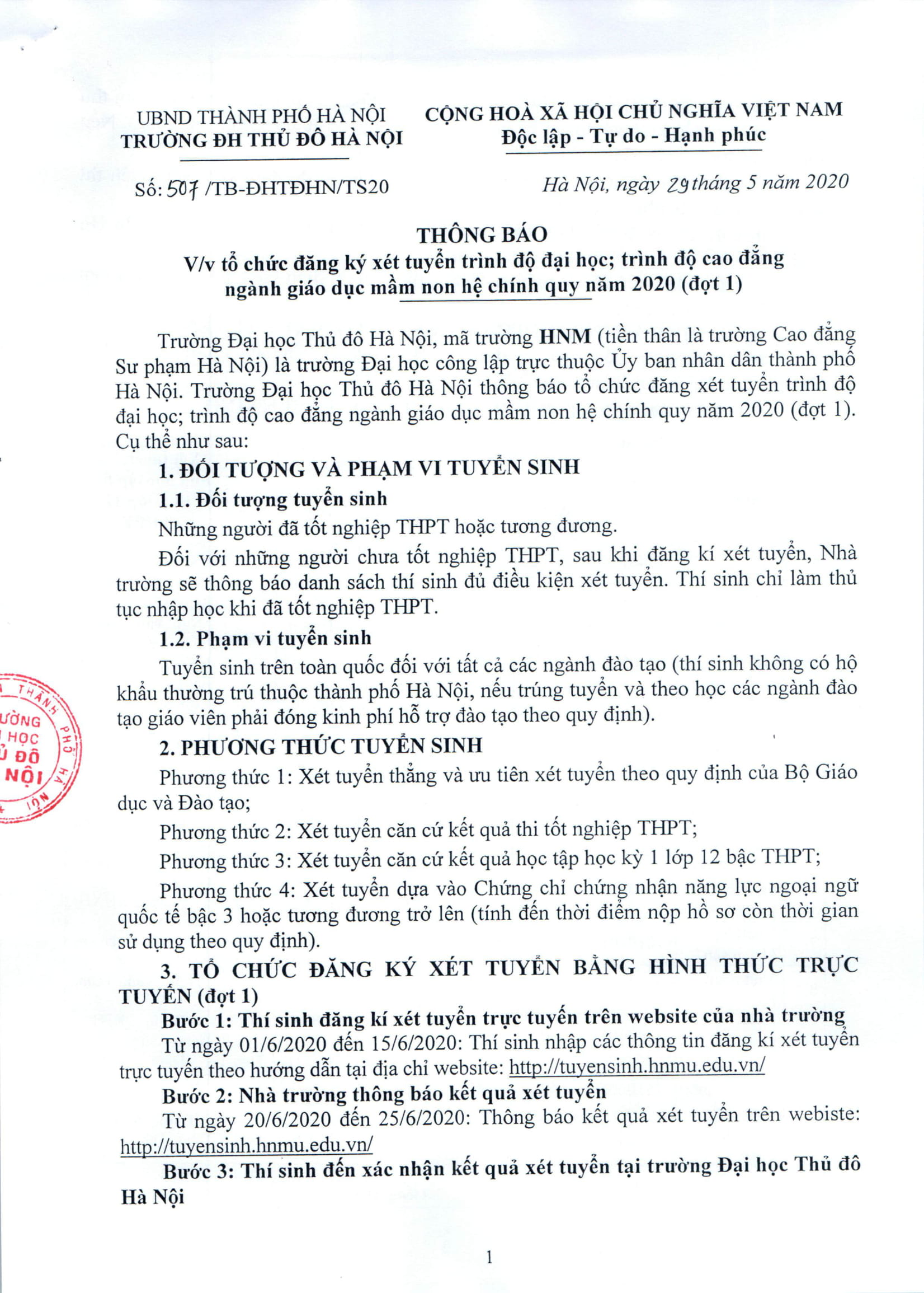 Thông báo vv tổ chức đăng ký xét tuyển trình độ đại học; trình độ cao đẳng ngành Giáo dục Mầm non hệ chính quy năm 2020 (đợt 1)