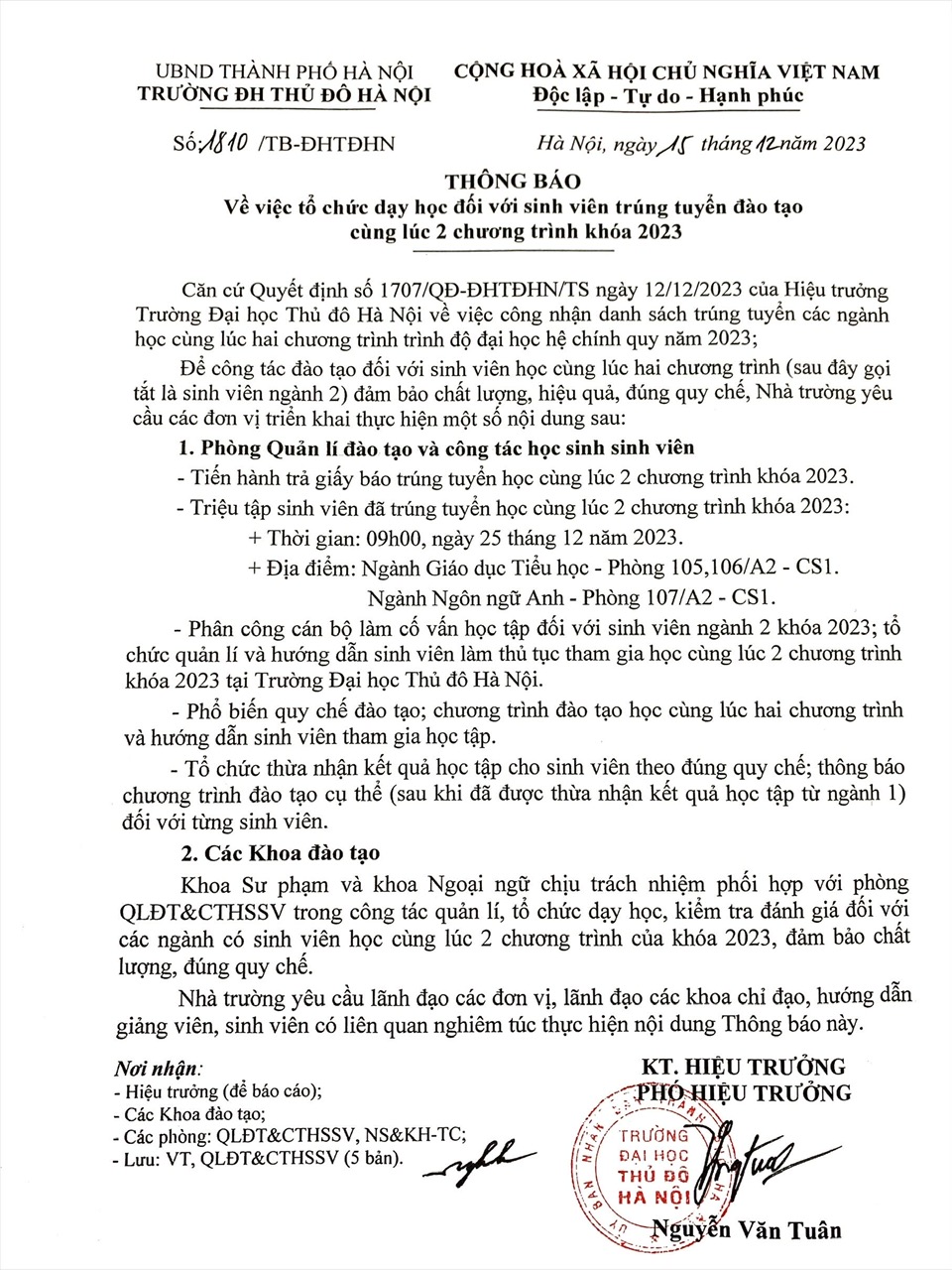 Thông báo vv tổ chức dạy học đối với sinh viên trúng tuyển đào tạo cùng lúc 2 chương trình khóa 2023