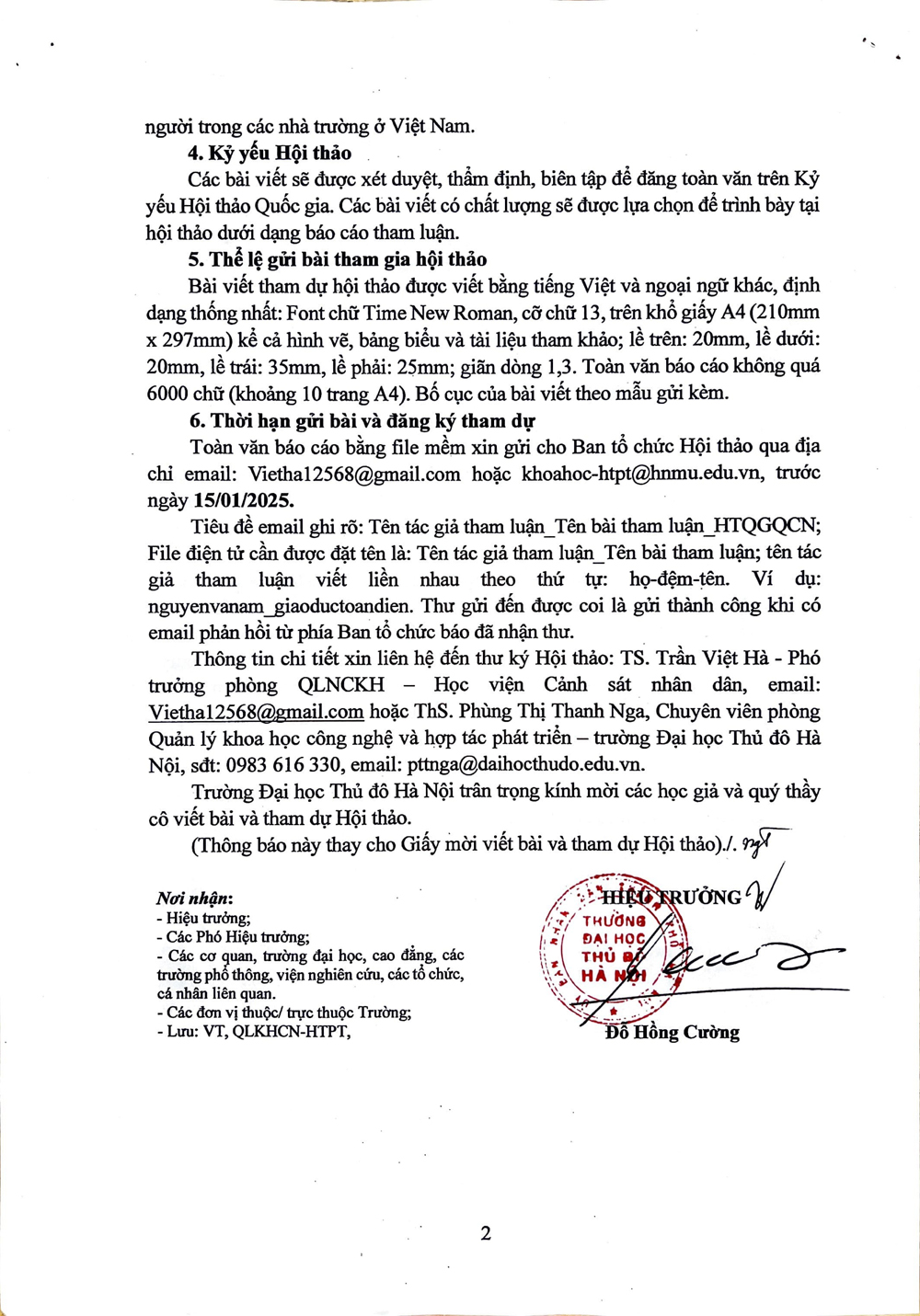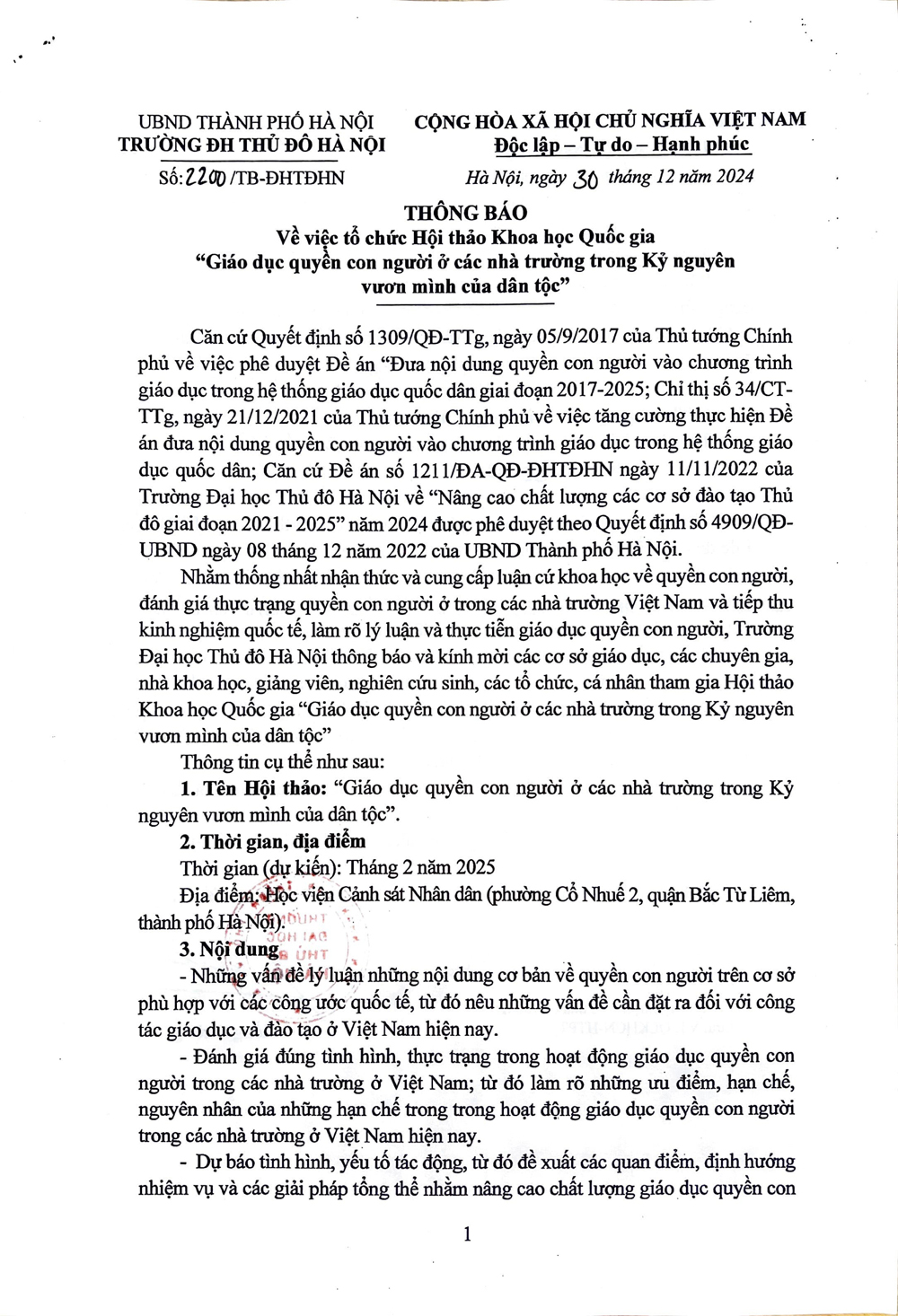 Tông báo tổ chức Hội thảo Khoa học Quốc gia "Giáo dục quyền con người ở các nhà trường trong Kỷ nguyên vươn mình của dân tộc"