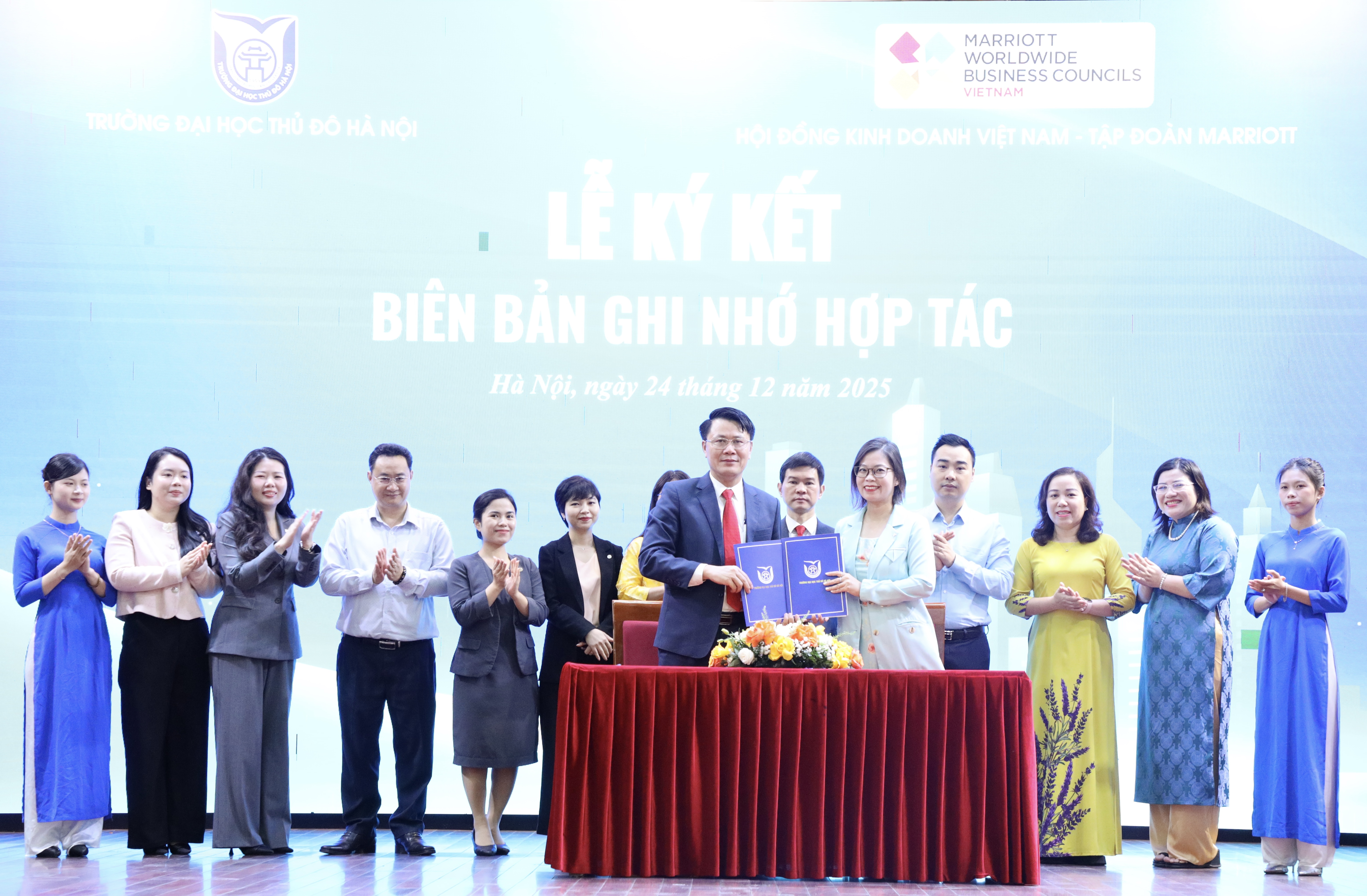 Lễ ký kết diễn ra trong không khí trang trọng với sự tham gia của đại diện lãnh đạo Nhà trường và các đối tác. Trong nghi thức đầu tiên, Trường Đại học Thủ đô Hà Nội đã tiến hành ký kết biên bản ghi nhớ hợp tác với Hội đồng Kinh doanh Việt Nam - Tập đoàn Marriott, tập đoàn quản lý hệ thống khách sạn lớn trên thế giới. Nội dung thỏa thuận tập trung vào việc thiết lập mối quan hệ đối tác chiến lược trong đào tạo và cung ứng nguồn nhân lực chất lượng cao. Sự hợp tác này mở ra những "cơ hội vàng" cho sinh viên nhà trường trong việc thực tập, hướng nghiệp và tuyển dụng tại môi trường chuyên nghiệp chuẩn quốc tế của Marriott, giúp các em tự tin bước vào chuỗi cung ứng nhân lực ngành du lịch - khách sạn toàn cầu.