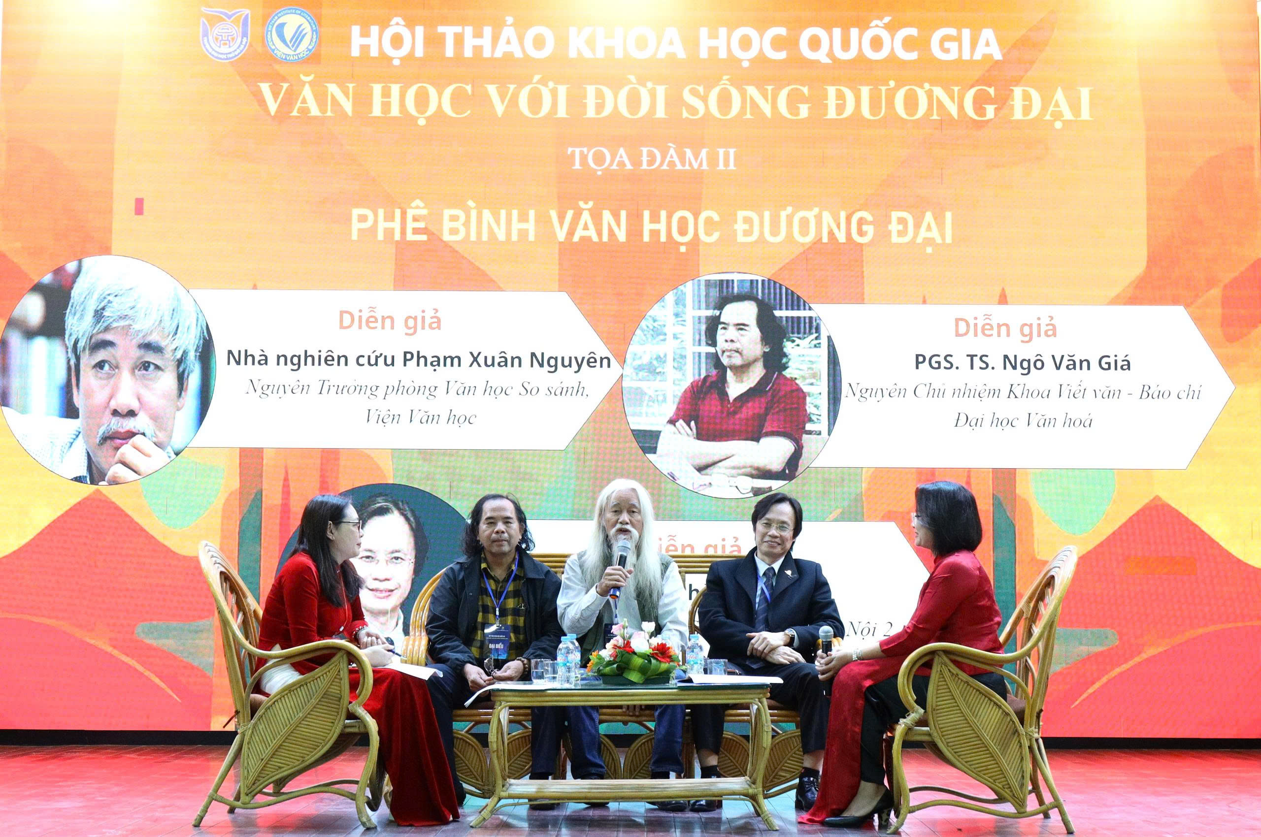 Tại phiên tọa đàm, các khách mời: Nhà nghiên cứu Phạm Xuân Nguyên (Hội Nhà văn Hà Nội), PGS.TS. Ngô Văn Giá (Trường Đại học Văn hóa), và PGS.TS. Phùng Gia Thế (Trường Đại học Sư phạm Hà Nội 2) đã chia sẻ nhiều ý kiến đa chiều về tình hình phê bình văn học đương đại.