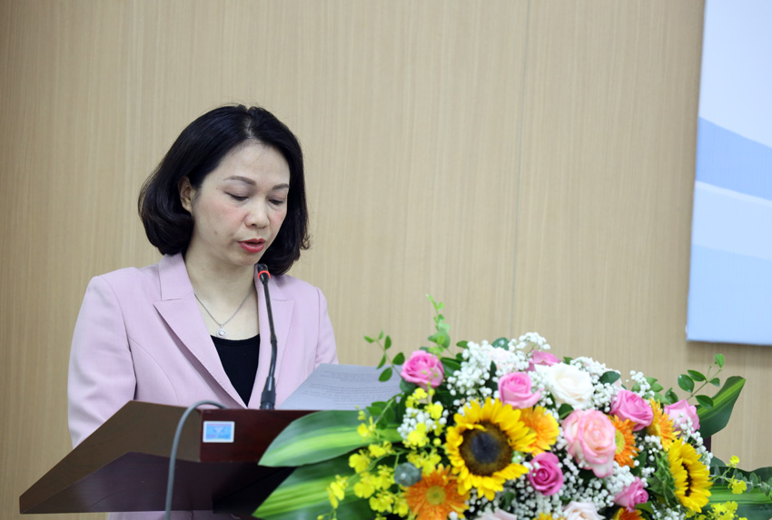 PGS.TS. Nguyễn Vũ Bích Hiền, Hiệu trưởng Nhà trường trình bày bối cảnh, thực trạng, nhiệm vụ, chỉ tiêu và những giải pháp phát triển